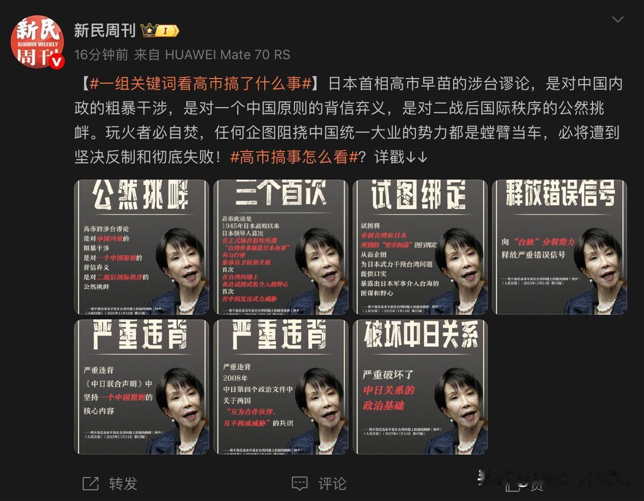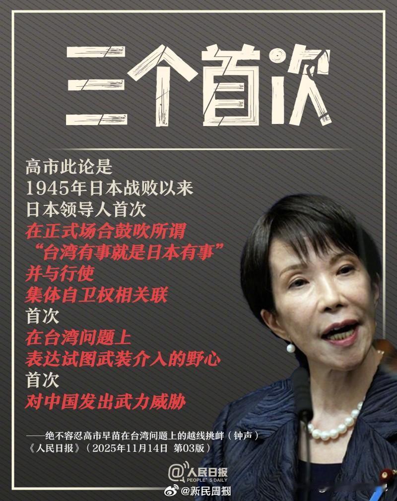 没想到高市才上台没多久就搞了这么多事情,几乎可以把高市与搞事划等号了。人民日报今天用同一格式总结并例数了高市的“七宗罪”,包括公然挑衅、三个首次、试图绑定、释放错误信号等等,“每一宗罪”都是有理有据的。这几张图片强烈建议大家收藏起来,以后要是有个风吹草动,这些可就起到了记事本的作用,发到外网上给本子民众和外国网友看看,这可是高市密集搞事在先,咱们新账旧账一起算可怨不得咱们!