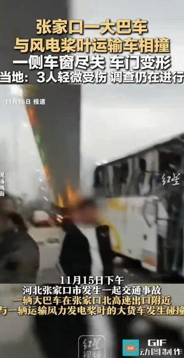 “让人后怕!”河北张家口市北高速出口附近,一辆运输风力发电桨叶的大货车与一辆大巴车发生碰撞。事故导致大巴车车头受损严重,右侧车窗玻璃几乎全部缺失,车门处严重扭曲变形! 来源:【红星新闻】 根据网传的现场画面,这起交通事故造成了大巴车严重损毁! 大巴车车头受损严重,车身右侧车窗玻璃几乎全部缺失,车门处严重扭曲变形! 庞大的风电叶片与大巴车车身紧密接触,叶片停留的位置与大巴车车顶相隔很近! 有现场目击者回忆,15日下午5时许,他路过事发现场时看到大巴车上还有乘客,但当时未见到受伤人员! 张家口市万全区有关部门工作人员向媒体透露,事故发生后,交警部门及时出警处置。 官方确认,这起事故造成三名人员受伤,已全部送医救治。 万全区相关部门明确表示,三名伤者均属轻微受伤,目前无生命危险。 关于事故责任认定,当地官方表示“该起事故目前暂未定责,正在调查处理中”。 巨型风电叶片与载客大巴车的碰撞,不仅是一条突发的交通事故新闻,更揭示了特殊运输监管与公共安全之间需要持续调和的矛盾! 但无论如何,这么严重的事故,没有人员伤亡就是不幸中的万幸了! 至于此次事故发生的具体原因,我们还是等待官方调查后的通报吧!