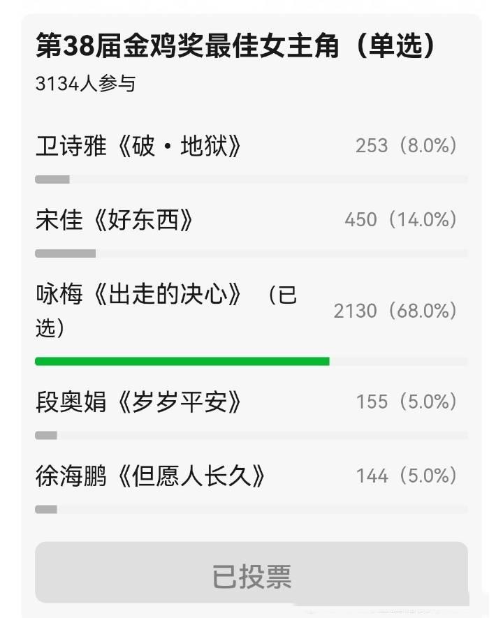 咏梅没获奖很正常, 就像郝蕾说的:合着奖项是被几个名不见经传的人玩转了?孩子的眼睛比评委的打分表干净多了。 咏梅一看就是性格老实的一类人,不如宋佳圆滑交际能力强,而且宋佳老公是导演,两人强强联合,运作起来肯定更便利。 再加上宋佳也有能力,有实力、有背景当然会得奖了! 只是可惜了咏梅,柏林电影节的影后,在国内只捞到一个提名,她可是民选的最佳女主角呀。 你们觉得咏梅是不是更应该得奖呢?