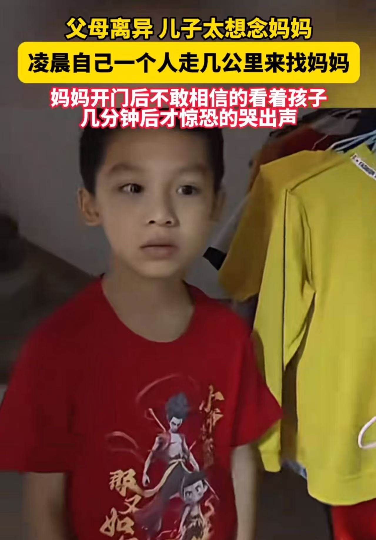 广东,父母离异,儿子因为太想念妈妈,凌晨一个人从爸爸家走几公里来找妈妈!当妈妈看到儿子站在门口,一脸不敢相信,随后惊恐哭出声!妈妈:“凌晨5点多,让这么小的孩子一个人光着脚丫跑出来,不给我孩子的抚养权,又不照顾好孩子,负责任吗?”