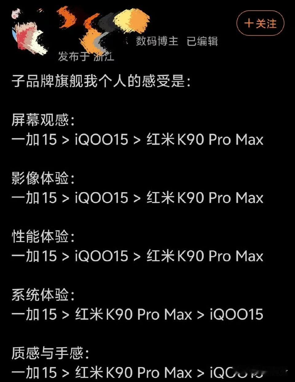 中端机排名中,一加 15竟然位居第一。 网络上流传着一份终端机品牌旗舰排名,其中一加 15超越了 iQOO 15 和红米 K90。 无论是屏幕观感、影像体验、性能表现还是系统方面,一加 15都更胜一筹,可以说达到了相当高的水准,不知这其中是否存在收钱办事的隐性问题。 同时,这也从侧面反映出一加系列手机在消费者心中确实表现不俗,无论是外观设计还是系统体验都可圈可点,一加15 iqoo15 一加手机 一加15手机 高端一加 OPPO 也一直十分重视一加这个品牌。 希望一加继续加油!