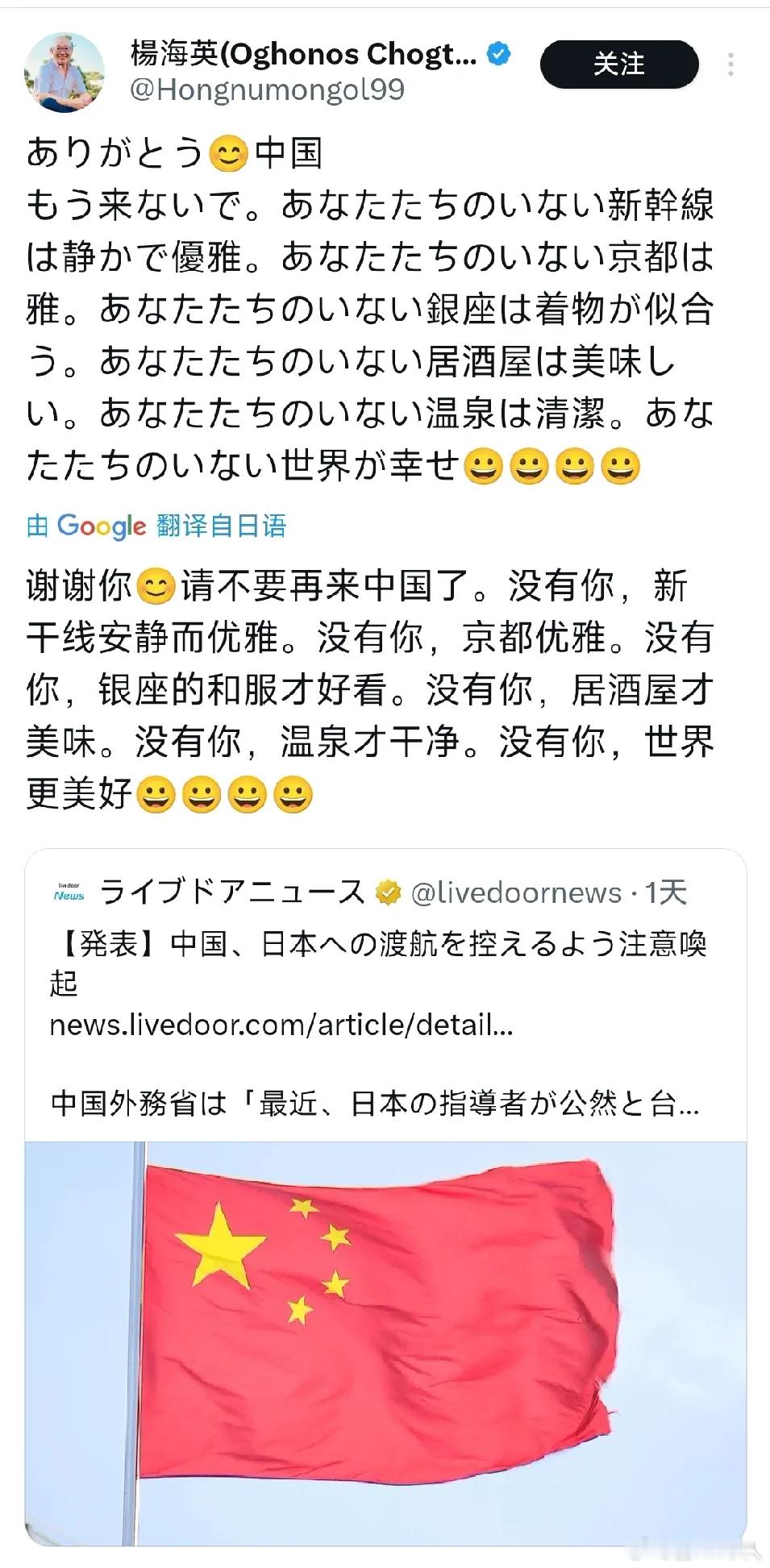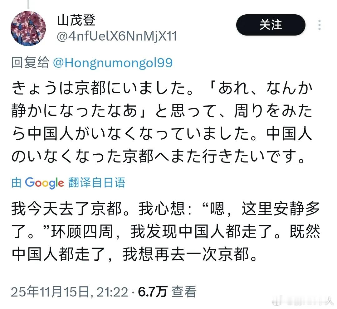 日本鬼子德性果然和香港废青差不多。高市早苗介入台海谬论后,日本对她支持一边倒,82%支持她介入台海言论外,她内阁支持率也大幅提升到69%。这是他们内部可怕的不知死活民意,原子弹下无冤魂不算过分,真的是雪崩了没有一片雪花是无辜的。而日本民间正欢呼中国游客不要去:他们不在的时候,酒店很安静!我今天去了京都。我心想:"嗯,这里安静多了。"环顾四周,我发现中国人都走了。既然中国人都走了,我想再去一次京都。没有你,新干线安静而优雅。没有你,京都优雅。没有你,银座的和服才好看。没有你,居酒屋才美味。没有你,温泉才干净。没有你,世界更美好香港废青当年也欢呼大陆不去,结果后来经济残了。小日子经济规模大,在国家发出安全预警后,那中国还去旅游的,确实就是犯贱了。