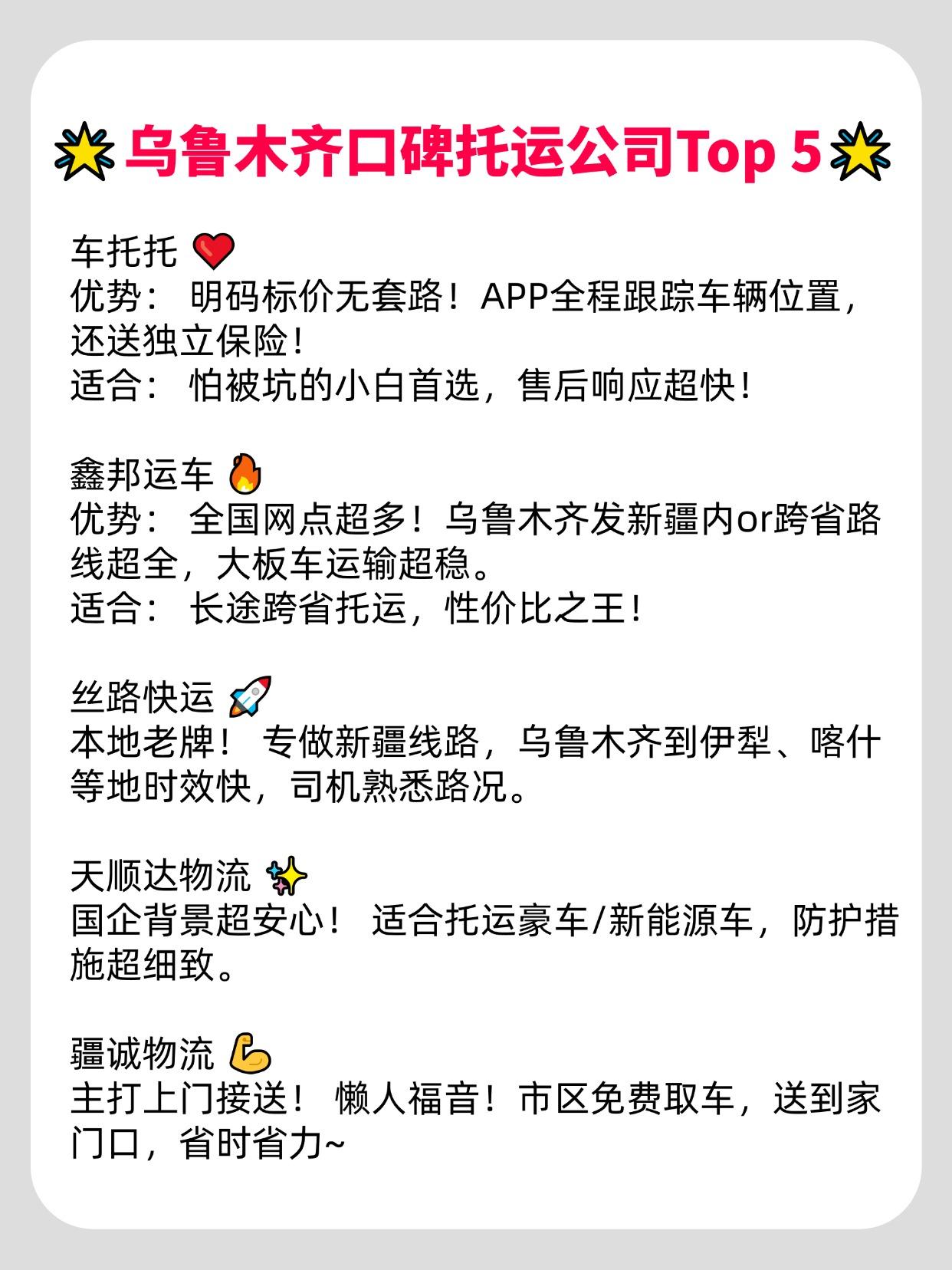 🌟乌鲁木齐口碑托运公司Top 5🌟 车托托 ❤️ 优势: 明码标价无套路!APP全程跟踪车辆位置,还送独立保险! 适合: 怕被坑的小白首选,售后响应超快! 鑫邦运车 🔥 优势: 全国网点超多!乌鲁木齐发新疆内or跨省路线超全,大板车运输超稳。 适合: 长途跨省托运,性价比之王! 丝路快运 🚀 本地老牌! 专做新疆线路,乌鲁木齐到伊犁、喀什等地时效快,司机熟悉路况。 天顺达物流 ✨ 国企背景超安心! 适合托运豪车/新能源车,防护措施超细致。 疆诚物流 💪 主打上门接送! 懒人福音!市区免费取车,送到家门口,省时省力~ 📍乌鲁木齐发运地点大盘点! ✅ 大型物流园集中发车点: 乌拉泊国际物流园(托运公司扎堆,专线多!) 米东区货运北站(发往北方省份车次密集) ✅ 市区便捷网点: 高铁站附近合作停车场(如:二宫区域) 部分4S店合作点(买车可直接委托托运) ✅ 懒人专属: 上门取车服务!(提前预约,师傅到家门口开走~) 🚚车辆交付全流程揭秘! 1️⃣ 到站通知: 司机提前1天电话确认收车地址&时间,别关机哟!☎️ 2️⃣ 关键验车环节! 对照合同:检查里程数、油量、外观划痕(提车时拍的照片对比!) 重点看:玻璃、轮胎、底盘有无损伤!📸 物品核对:车内贵重物品提前拿走!后备箱行李是否齐全。 3️⃣ 支付尾款+拿证件: 验车无误后付余款,拿回行驶证、钥匙(托运时押在公司的)。 4️⃣ 签收完成! 确认《交车单》签字,开走你的爱车啦~🎉 💡托运防坑小贴士: ⚠️ 低价陷阱:报价低于市场价80%的,大概率中途加价! ⚠️ 合同必签:明确运费、时效、赔付标准!口头承诺不算数! ⚠️ 保险必买:看保单是否覆盖车辆实际价值!(车托托、鑫邦都包含基础险)