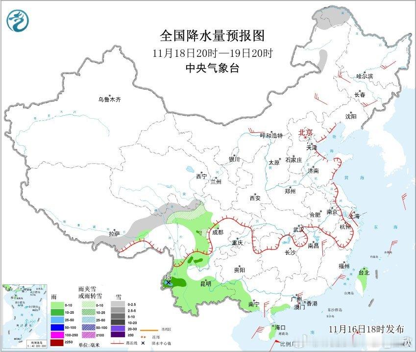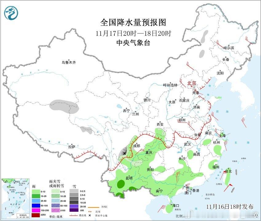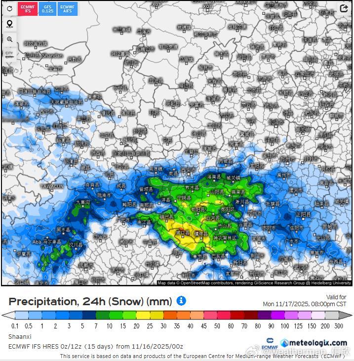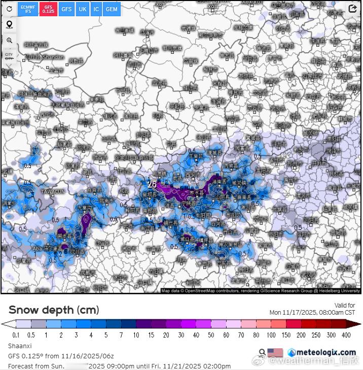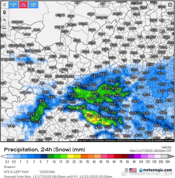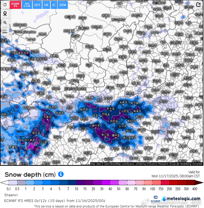 【降水】相比今天,今晚到明天四川陕西重庆湖北河南一带的降水明显增强,而且在秦岭、大巴山、伏牛山等山区会出现大到暴雪(10~17毫米),新增积雪深度5~10厘米,局地可超过15厘米;陕西东南部、重庆北部、湖北西部等地部分地区有大雨(25~40毫米)。图3-4为欧美数值预报给出的降雪量,如果寒潮降温速度超预期,且700百帕水汽也超预期,河南湖北一带的降雪,可能比图2官方报的范围更大。西安和郑州17日晨处于雨雪临界,能否降雪悬念很大。总体看,今晚到明天为本轮寒潮过程降水范围最大时段,之后降水向西南收缩,我国大部到江南华南,晴朗干燥。