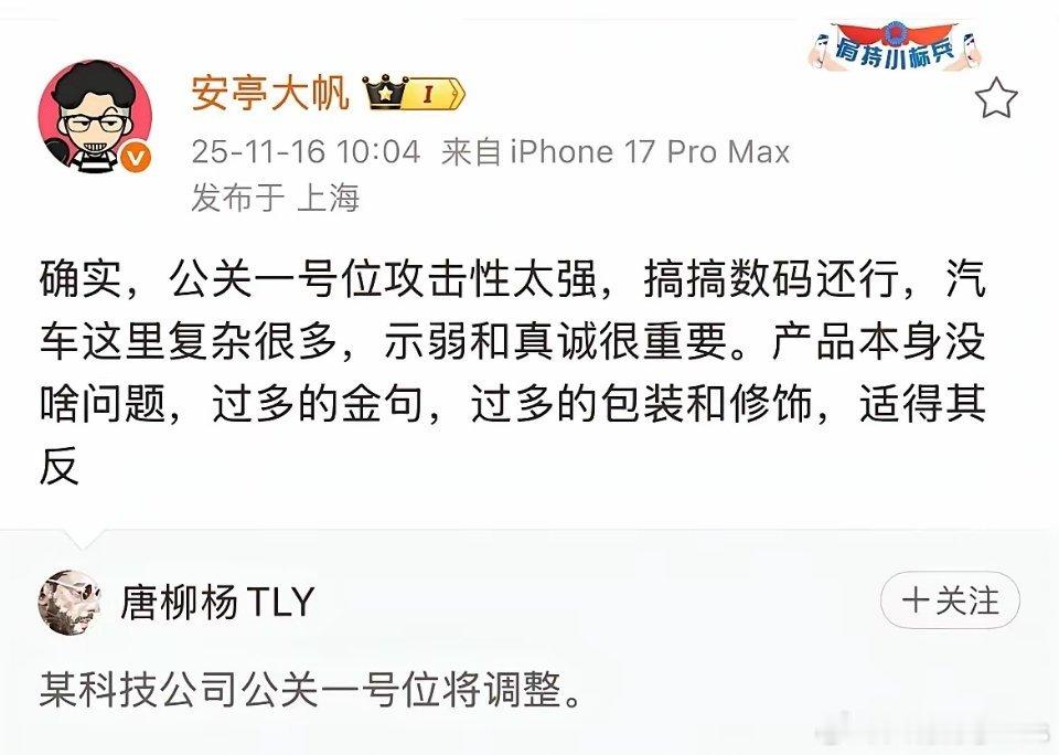 有大V爆料:某家科技公司的公关一号位将被调整,你们猜猜是哪家?注意是攻击性太强的那家公司