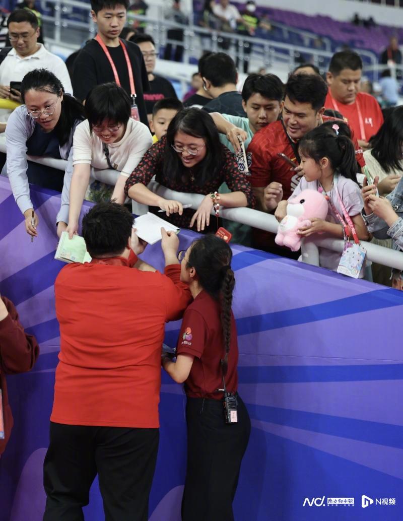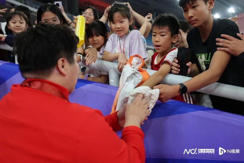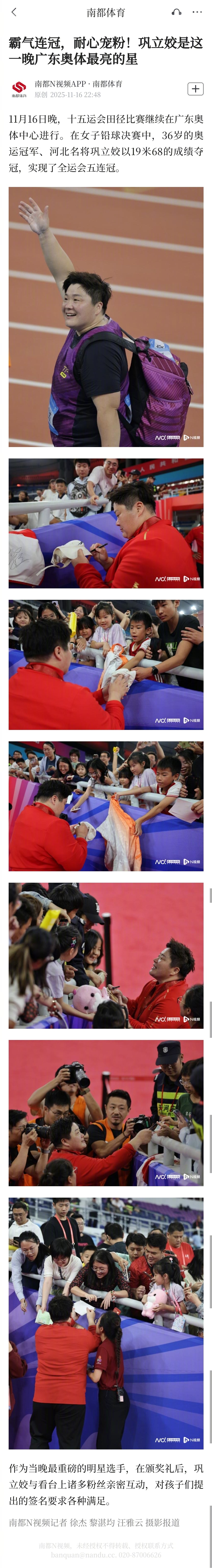 【霸气连冠,耐心宠粉!巩立姣是这一晚广东奥体最亮的星】11月16日晚,十五运会田径比赛继续在广东奥体中心进行。在女子铅球决赛中,36岁的奥运冠军、河北名将巩立姣以19米68的成绩夺冠,实现了全运会五连冠。作为当晚最重磅的明星选手,在颁奖礼后,巩立姣与看台上诸多粉丝亲密互动,对孩子们提出的签名要求各种满足。南都N视频记者 徐杰 黎湛均 汪雅云 摄影报道