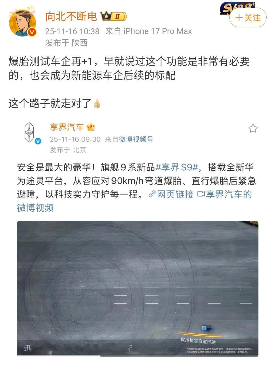 向北不断电:爆胎测试车企再+1,早就说过这个功能是非常有必要的,也会成为新能源车企后续的标配,这个路子就走对了[赞] 对于电车这种爆胎测试非常的有意义,因为电车,它不像现在的燃油车的控制逻辑,因为电车由于马力大,突然爆胎之后确实更容易发生失控的情况。 传统的ABS并不能应对,绝大多数情况还是需要车辆有动态调整的能力,特别是在湿滑路面上,该功能拥有非常大的作用,防止突然失控。 各位是怎么看的?欢迎评论区留言。