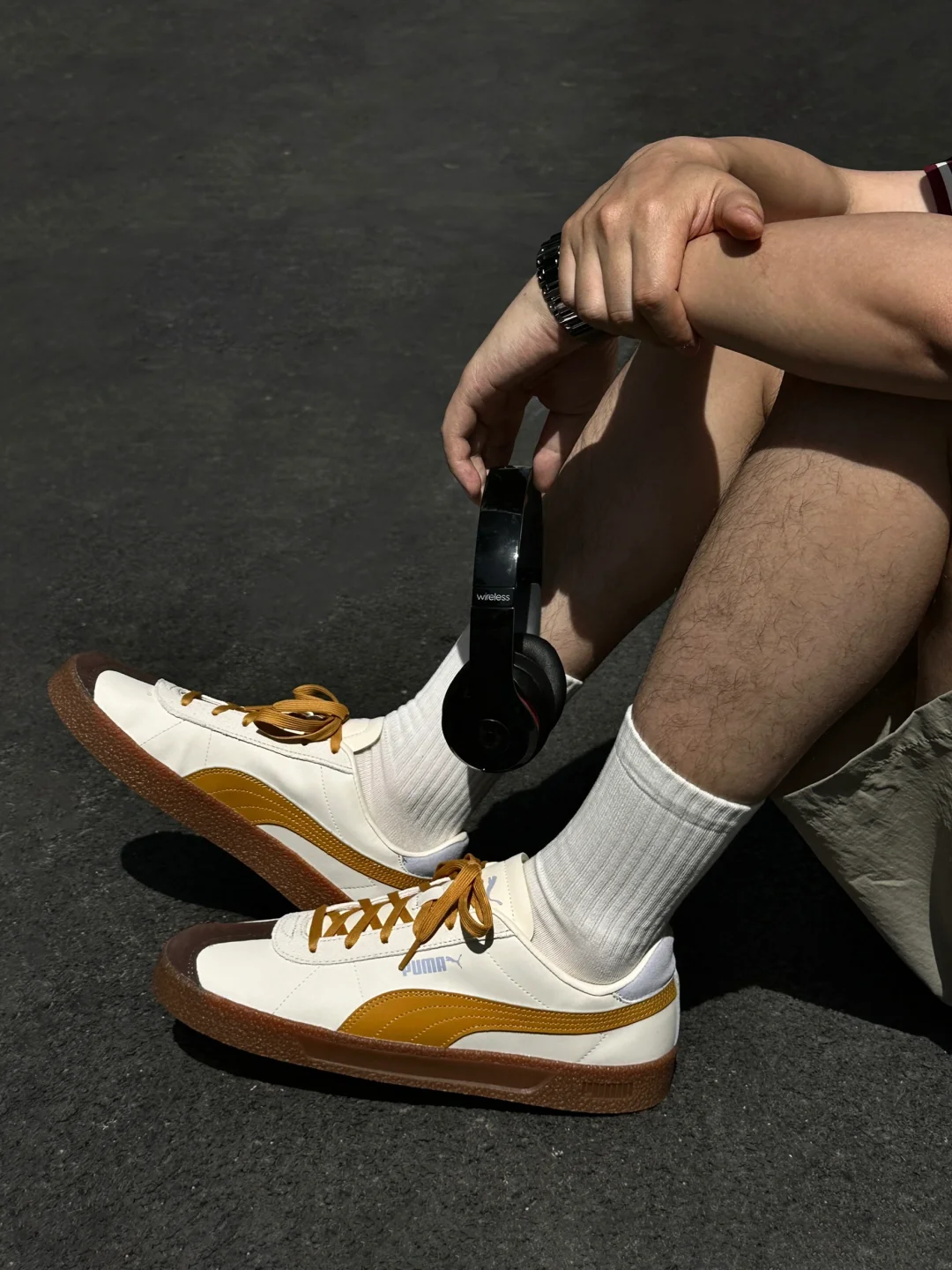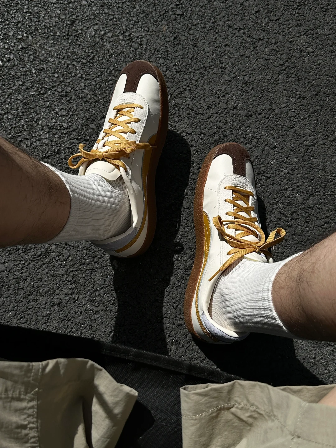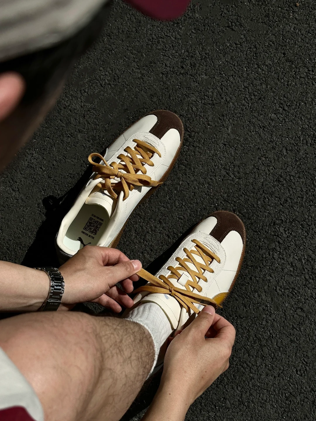 最近是复古回潮了吗 真的会爱这双德训鞋 这不就是预定夏天的配色吗 橙色咖啡跟奶白色的碰撞一整个牛乳吐司配色 满满的复古feel 日常搭配也很好搭 而且脚感还很棒