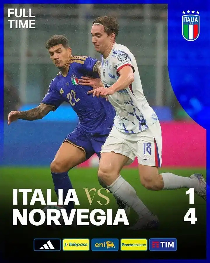 “就让着大雨全都落下”欧洲区世预赛小组赛第10轮,挪威客场4-1逆转意大利,全胜晋级世界杯正赛!而意大利最终排名小组第二,将会通过附加赛竞争参加世界杯的机会。挪威就此成为了世预赛历史上,继2022年3月的北马其顿(客场1-0击败意大利)以来,第二支能够客场击败意大利的球队。近年来,“蓝衣军团”在世界杯预选赛中的糟糕表现已是有目共睹,这已经是他们连续第三次进入世预赛的附加赛阶段,而此前两次他们均未能从中杀出重围…
