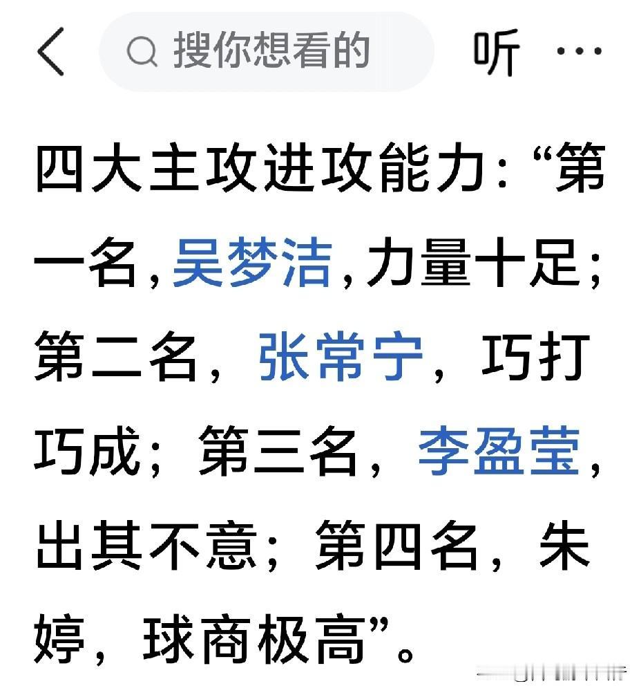 吴梦洁排名第一,张常宁排名第二,李盈莹排名第三,朱婷排名第四。不知这是什么人评选出的全运会四大主攻。 前几天还看到过更雷人的评论,说什么吴梦洁、庒宇珊两人实力超过李盈莹,国家队不需要李盈莹了。