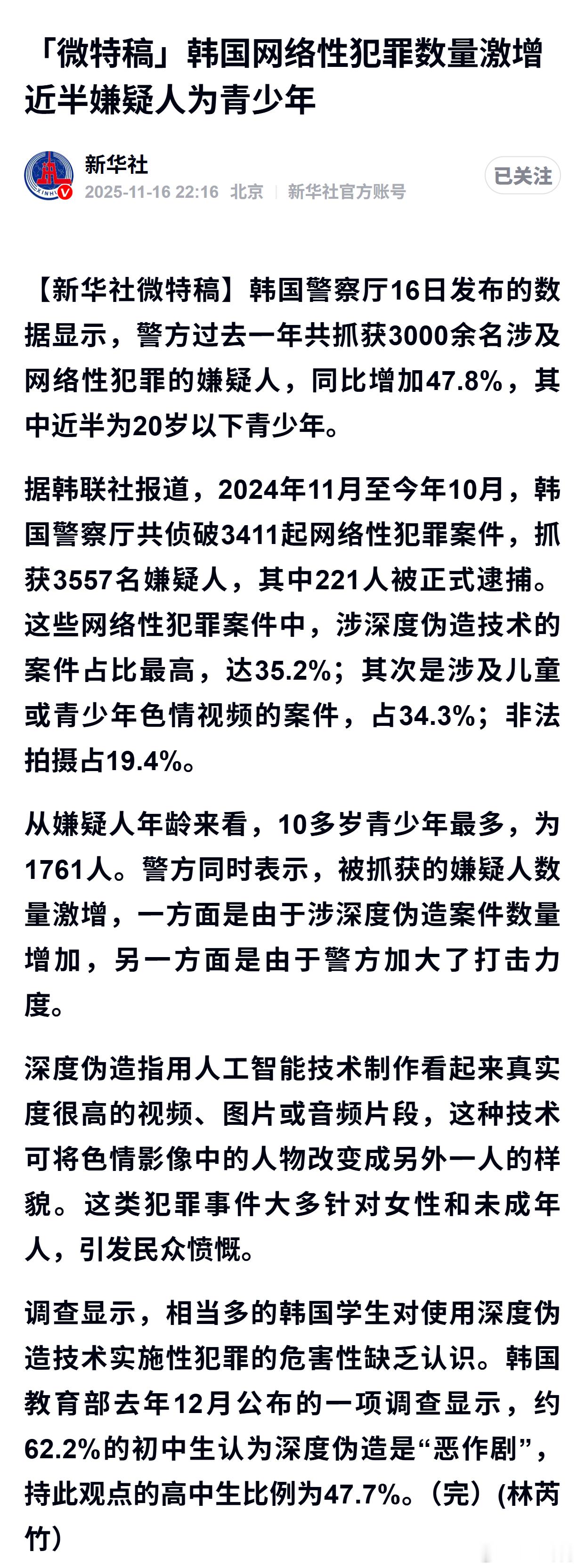 韩国网络性犯罪数量激增近半嫌疑人为青少年