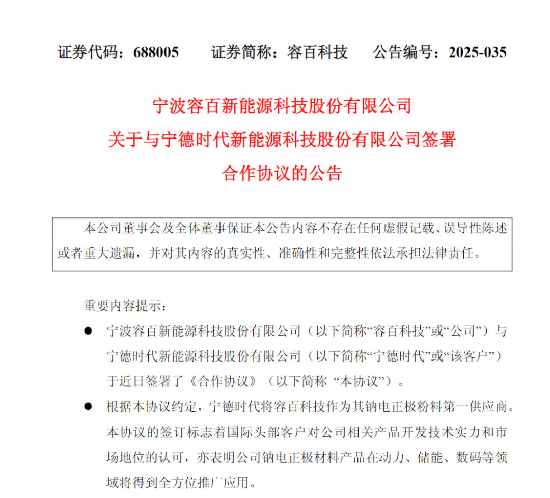 【】 新能源行业又现大单合作。容百科技公告与宁德时代签署合作协议,根据协议,宁德时代将容百科技列为钠电正极粉料第一供应商,并承诺每年向容百科技采购比例不低于总采购量的60%。 协议中提到,如果宁德时代当年采购量达到50万吨及以上,容百科技将给予更优惠的价格。 这份协议自签署日起生效,有效期至2029年12月31日。协议到期前3个月,双方如无异议,自动续约。 这份合作协议是两家企业从三元锂电池到钠电池的合作升级。自2022年成为宁德时代三元正极材料供应商后,容百科技此次再度携手宁德时代,将合作领域拓展至更具成本优势的钠电池材料。