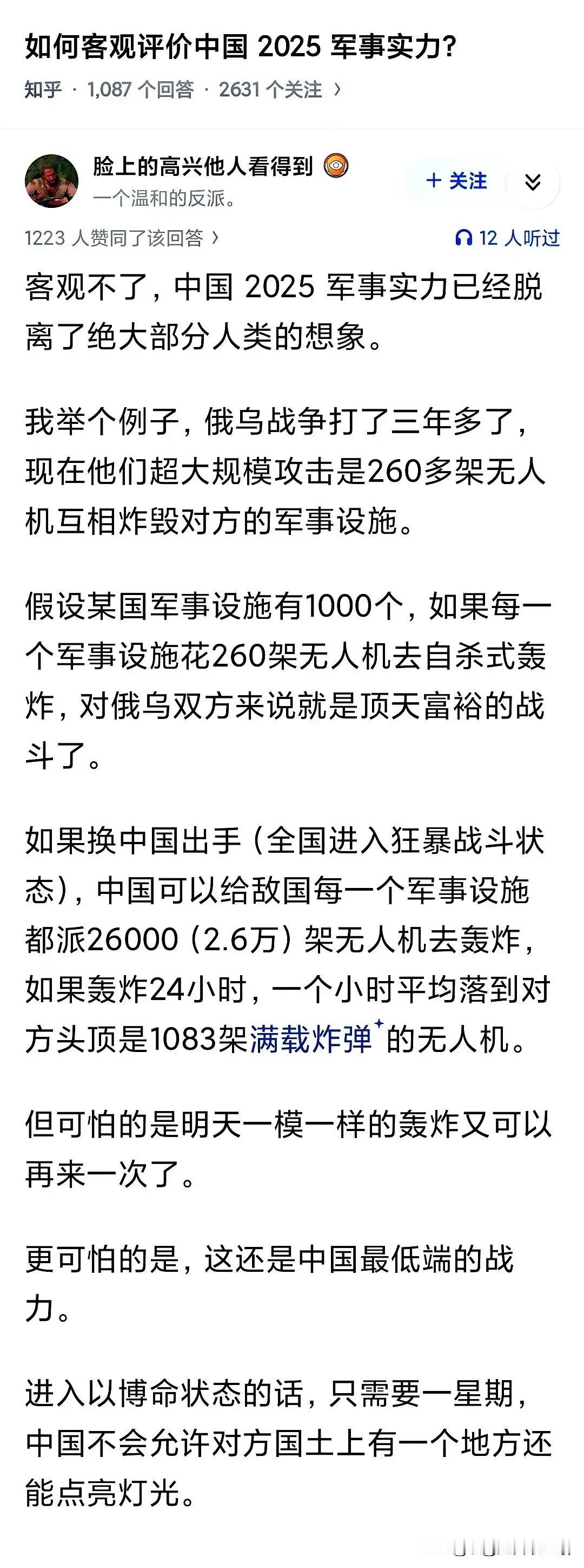 自信可以有,但不要过分! 俄乌冲突打的确实没有那么高科技,但是对这两个国家来说,也是已经拼尽了全力。但是不要嘲笑,不要自大。毕竟俄乌冲突打的是持久战,不是一上来就倾尽全力梭哈,而是一步步的对峙。 咱们的军事实力很强,但是多强是没人知道的。咱们大多数人都不清楚,何况是国外。所以咱们现在面临的问题,就是周边霄小国家,不知道底细。 比如东边的日本,现在蹦跳的极高。就是觉得自己有实力去赌一把,所以言论就特别的出格。甚至觉得可以梭哈一把一样,赢了就是甲午战争,输了就是太平洋战争。 军事实力强大,不仅要自己知道,也得让对手认可。印度网友天天说自己是世界第三强国,有人认可吗? 咱们的网友,可以自信,但别自大。军事实力强了是好事,但是没有实战,对手也不会认可,因为对手觉得自己也很强。