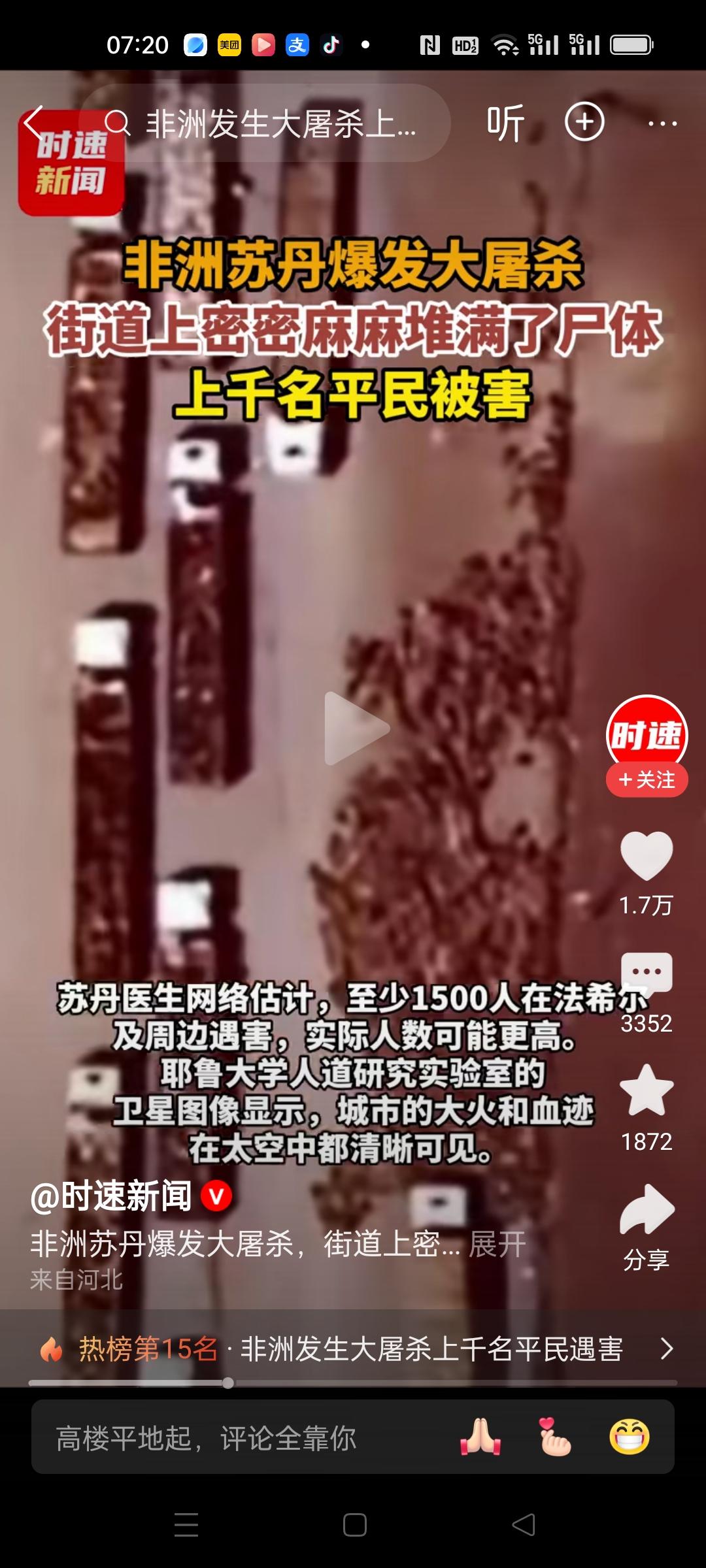 非洲苏丹爆发大屠杀,街道上密密麻麻堆满上千具尸体。 由于焦点都被俄乌战争,和加沙冲突吸引,这个发生在苏丹一年半的内战都没有被联合国提上日程。 这个世界并不太平,很庆幸我身在一个和平的国家,有安定的生活是多么幸福的事情!苏丹问题 苏丹遇袭