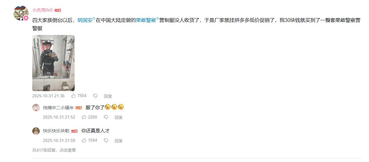 果敢四大家族都倒闭两年多了,没想到果敢四大家族的服装,30元一套甩卖,还没卖完!这是明家集团定制的制服,结果倒台了,没人收货,清仓大甩卖!大家也可以看到,其实果敢四大家族的各支下属武装,其实穿的衣服都不一样,都是为了分开彼此的区别。 明家集团在国内订购的服装,还没到货,结果在2023年11月中旬就,明家集团已经被通缉和抓捕过来。所以那些已经付钱订购的服装,没人收货,运过去也没用了。而且在这些服装注定以后在果敢地区,也用不上。 所以最终结局只能在国内各个电商网站上,30元一套大甩卖,但是甩卖了两年,都没卖完,因为这套服装不吉利,没人愿意买这种已经战败武装的制服,也就是图个开心而已。 30元一套服装还包邮,想一想其实挺便宜的,但是没人愿意买,因为不吉利。明家集团已经被宣判,明珍珍为代表的多人,已经被判死刑,还有更多人死缓和无期徒刑,已经量刑比较重了,所以局势就是这样。 大家也可以看到,现实战败的武装,就成了落水狗,人嫌狗不待见,连军装都卖不出去。整个老街会战中,果敢四大家族的武装,打的很不好。但是明家集团的卧虎山庄,还是挺难打的,打了好多天才拿下来,明家集团的武装,应该果敢四大家族里,打的最好的。