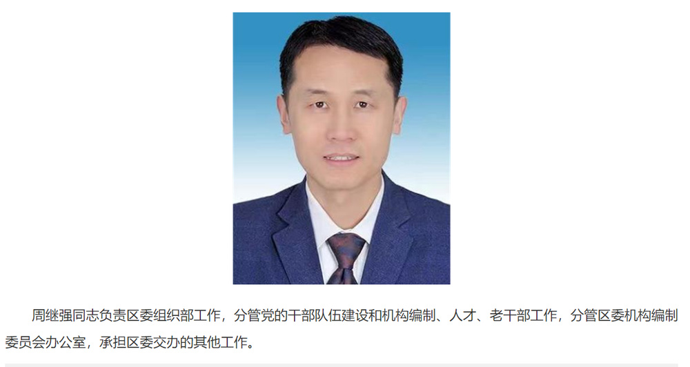 据济南市天桥区委官网消息,周继强已任区委常委、组织部部长,负责区委组织部工作,分管党的干部队伍建设和机构编制、人才、老干部工作,分管区委机构编制委员会办公室,承担区委交办的其他工作。