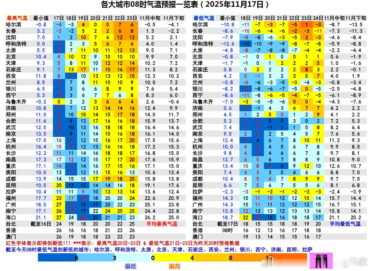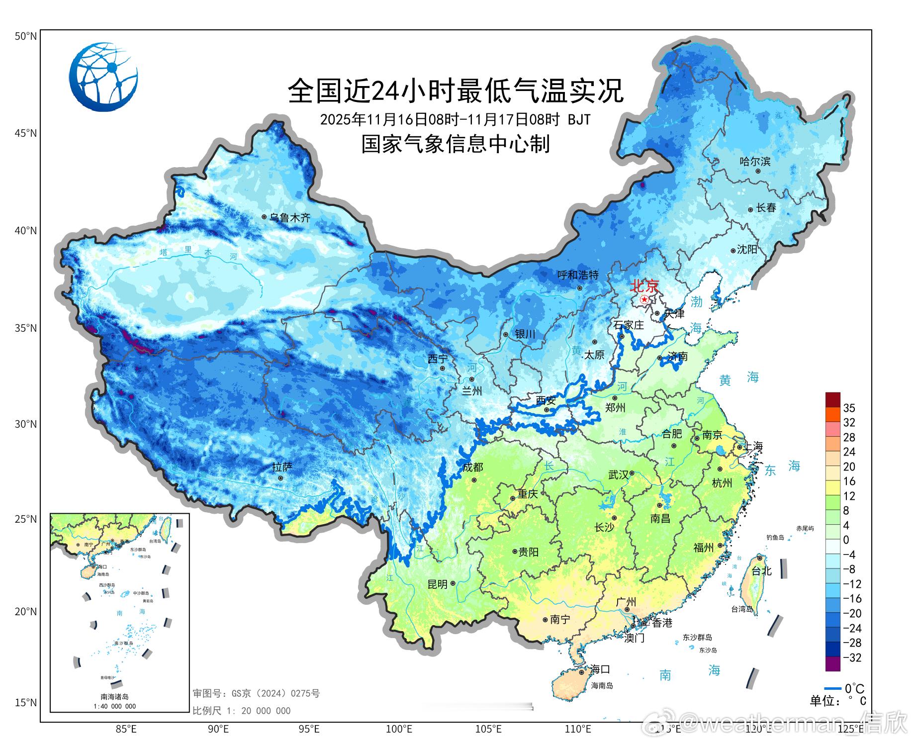 【气温创新低】今晨在寒潮影响下,长江以北多地出现降温。截至8时有13个省会首府直辖市气温创立秋后新低。其中哈尔滨为首次跌破零下10℃。明晨创新低会更多,目前预报有24个省会首府直辖市,长春、银川、西宁,将首破零下10℃;济南、合肥将是首次破零。今晨截至8时最低(℃):呼和浩特老国家站(53463)-12.6、哈尔滨-10.8、西宁-8.6、银川-8.2、太原老国家站(53772)-4.8、兰州-3.8、拉萨-2.3、天津西青-1.7、北京南郊观象台-0.8、济南0.6、石家庄鹿泉0.8、西安泾河4.2、昆明6.6。