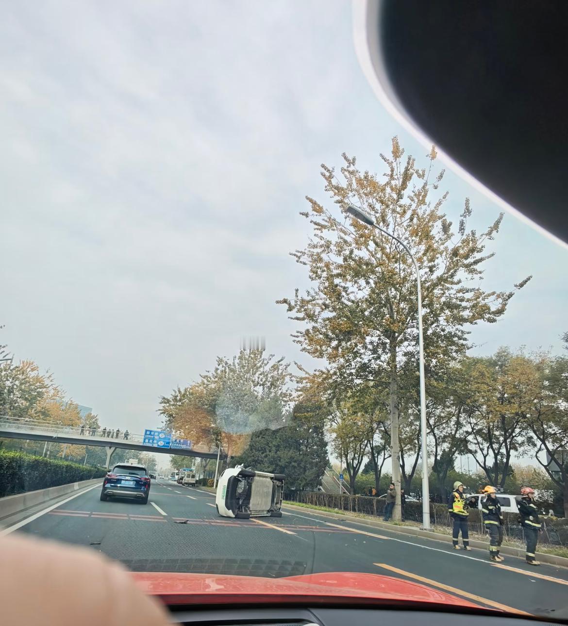 下午三点多,南三环玉泉营桥那辆黑色特斯拉突然横着飞出去,车身拍在隔离带上,四轮朝天把两条车道堵得严严实实。 我刚好在隔壁辅路,远远就看见高架上一排刹车灯唰地亮起,高德瞬间红到发紫。 司机被消防拖出来时脑袋上还渗血,路政车赶到前整条三环成了停车场,导航显示三公里蠕动,平均时速八公里,比散步还慢。 风大路面湿,轮胎一滑车就甩尾,电动车重心低也架不住横着拍,碎片撒一地,后车全得变道,电动车车主群里有人秒回:雨后胎压没调,ESP也救不了。 四十分钟后吊车把车翻过来拖走,车流才喘口气,司机送天坛医院,人没大事,车估计全损,保险查勘员现场皱眉拍照。 再贵的辅助驾驶也抵不住一脚急刹配湿滑路面,三环不是赛道,稳住电门比啥都强。