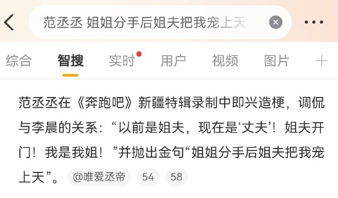 2025年11月16日《奔跑吧》新疆特辑录制中,范丞丞即兴抛出一段荒诞台词:“以前是姐夫,现在是‘丈夫’!姐夫开门!我是我姐!”,并调侃“姐姐分手后姐夫把我宠上天”。该言论通过身份错位和家庭关系反转制造喜剧效果,现场反响热烈。范冰冰和范丞丞这一家子的关系,可真是够有戏剧张力的......