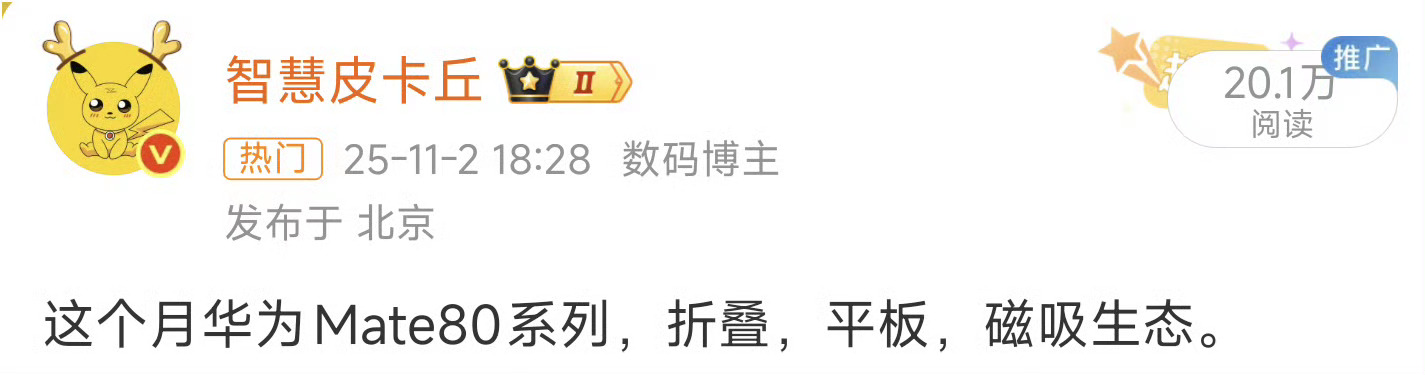 华为Mate 80系列 | Mate X7及全场景新品发布会,11月25日14:30,敬请期待! ProMax如何。这次货很足,28号鸿蒙星光盛典大家可以拿着华为Mate80观看了。HUAWEI Mate Pad Edge是平板和PC的超级变换形态,14寸OLED,通过鸿蒙生态+PC物理套件实现终端形态的切换。