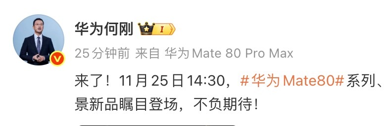 华为正式官宣:11月25日14:30,将举行新品发布会,带来全新的 系列、 系列视频中Mate80真机露出,金色,将会有双环设计,除了Deco还有磁吸环?此外,华为终端BG何刚在微博预热时使用的微博小尾巴显示为 “Mate 80 Pro Max”,提前曝光新品名称。