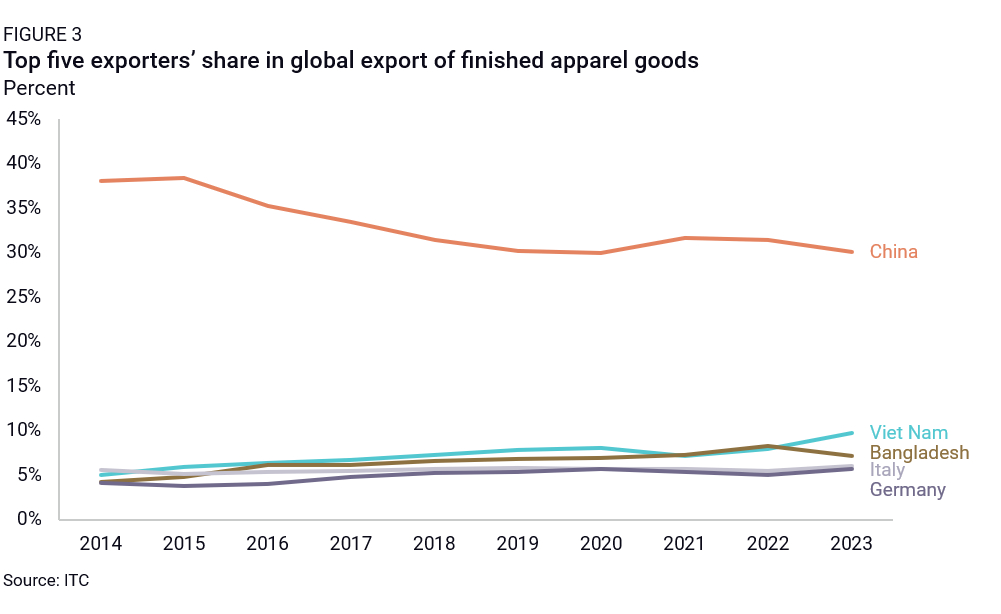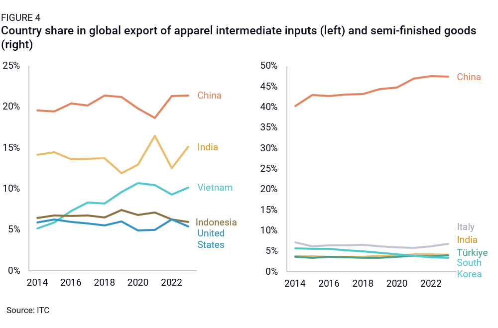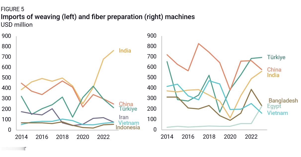 中国的工业化,服装行业是一条重要的向上通道。从 2000 年代初开始。中国纺织品和服装出口额从1992年的不到250亿美元增长到2010年的近2000亿美元,增长了8倍,当时中国对全球服装贸易的贡献率上升到35%,相当于接下来10个国家的出口总和。而且国内市场也在扩张, 2016 年,中国生产的本地消费服装与出口服装的数量一样多,这表明国内生产能力的规模更大。此后,中国的收入水平和制造成本大幅增加,2003年至2013年纺织业的工资增长了242%。越南、孟加拉国、印度、柬埔寨和土耳其等具有相对成本竞争力和丰富劳动力的国家开始吸收产能,越南在全球服装出口中的份额几乎翻了一番,从 2014 年的 5% 增加到 2023 年的 9.8%。孟加拉国的这一比例从 2014 年的 4.2% 回升至 2023 年的 7.1% 以上。但中国仍然是产能中心,到 2023 年,中国仍主要主导全球服装出口,低于 2014 年 38% 的全球出口市场份额,但仍占全球服装出口的近三分之一。中国还位居全球中间产品出口国榜首,包括涤纶和粘胶短纤维、棉和涤纶纱线、粗梳或精梳羊毛,以及针织或钩针织物、棉织物和鞋类零件等半成品。这些贸易数据可能低估了中国作为服装投入品供应国的作用,因为中国的一些服装价值链完全是国内的:中国经常在岸上将棉花转化为织物制成 T 恤,直到成品阶段才跨越国界。到 2023 年,越南、孟加拉国、印度、柬埔寨和土耳其等替代中心的多元化仍然相对较浅。中国仍然是所有替代中心纺织品投入品的主要供应国。这是因为下游细分市场的资本和技能密集度低于上游细分市场,因此可以更容易地转移。美国的关税也首先将组装活动从中国转移到越南、孟加拉国和印度。在替代中心中,印度是一个例外,其规模庞大的棉花和石化行业满足了当地和全球的需求。这种情况可能正在改变。近年来,印度、土耳其和越南都注册了大量织造机和纤维制备机的进口,这可能表明那里建立了更多的上游服装领域。(分享自阿加莎·克拉茨、劳伦·派珀和朱莉安娜·布肖的报告)