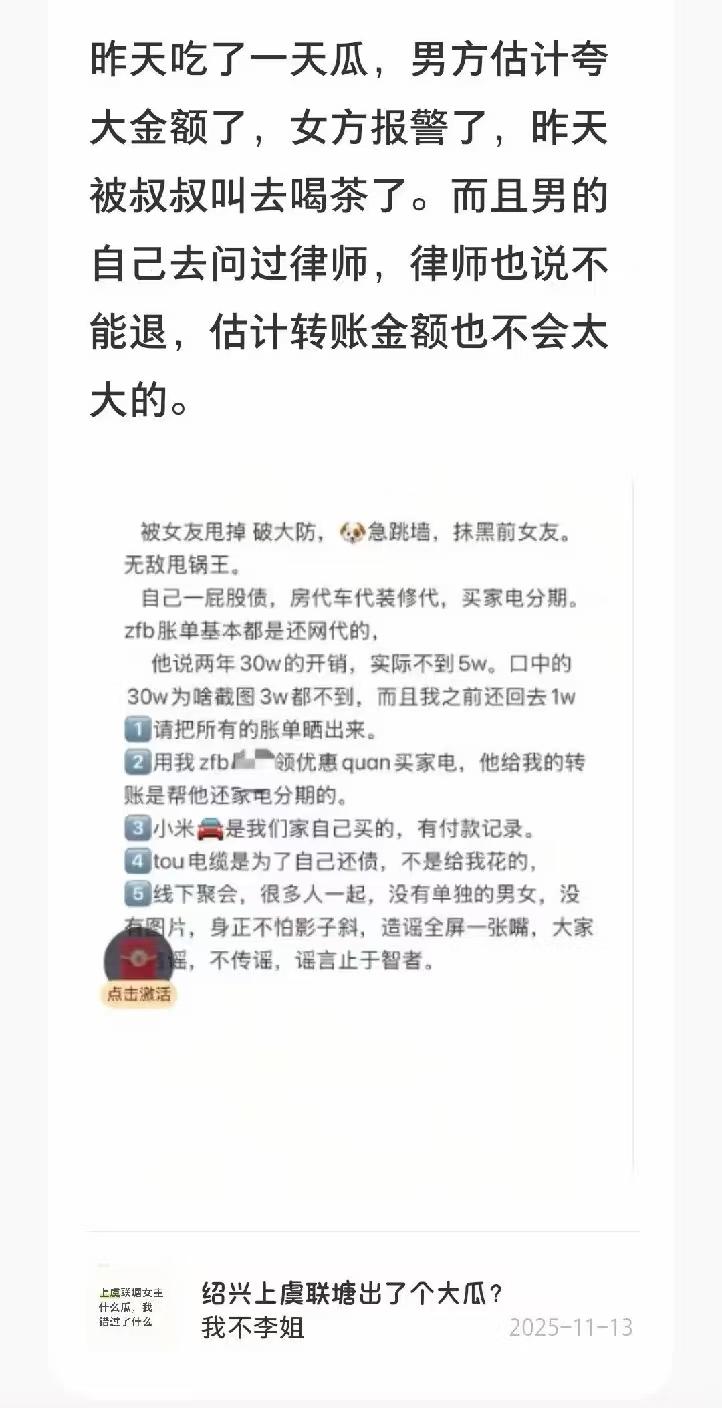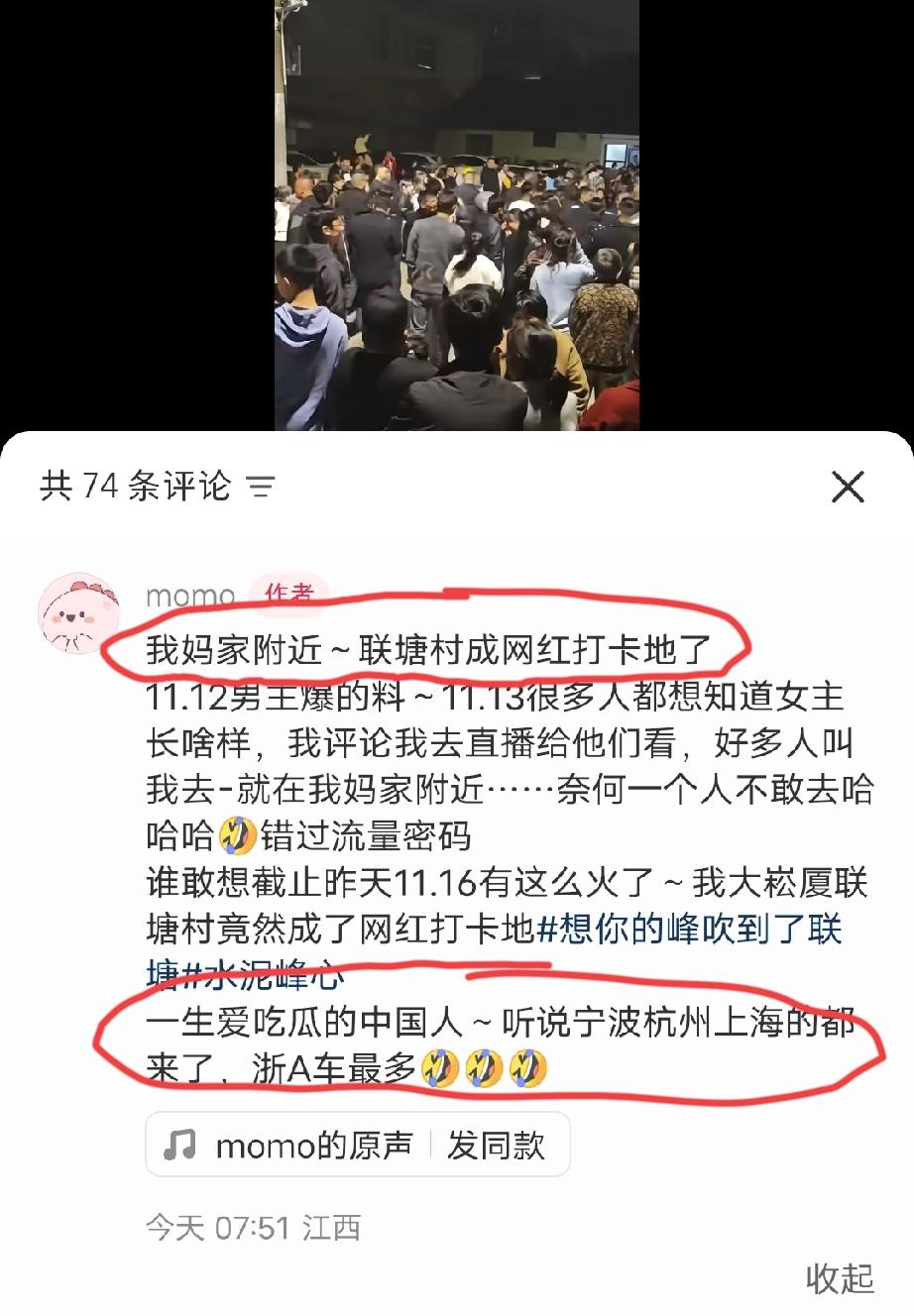 11月16日,浙江绍兴上虞,男女二人情感纠纷引发吃瓜群众围观,在女方家门口看热闹…… 据网友称:宁波、杭州、上海的都跑来了,最多的浙A牌照的小车。 至于事情的来龙去脉,网上也有两种说法,一种说是女的花了男的30万,一种说法是不到5万。 有一种说法是:俩人是别人介绍认识的,女的没工作,男的前前后后为这个女的花了三十多万,女的又不愿意结婚,又同时交往几个男的,被他发现了,找她还钱,女的不还让他去起诉。最可怕的是女的和别的男的开房用这个男的亲密付的。 而昨天为什么这么热闹,吸引这么多人吃瓜呢?因为男主的父母现身说法了! “一生爱吃瓜的中国人”,果然一点不错。可从外地跑去吃瓜,又是为的哪般? 评论区的诸位大神,这个事情上你们是什么看法?