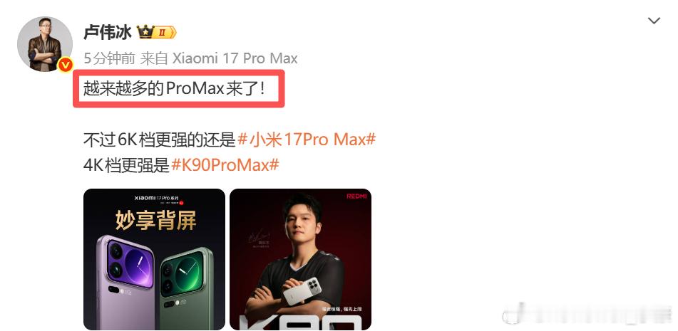 小米卢伟冰锐评,越来越多Pro Max来了。(这小老弟冲浪速度很快)