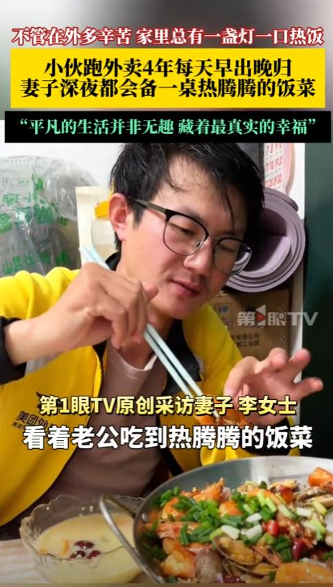 湖北武汉,外卖丈夫深夜回家,妻子的一个习惯坚持了4年。当镜头对准他家餐桌,答案让无数人破防。原来,男子和他妻子在初中就相识了,他们从校园到婚纱。 据第一眼新闻11月16日报道,湖北武汉,深夜的街头已经行人寥寥,一个送外卖的男人还在飞驰,为了多接一单,多挣几十块钱。 与此同时,他家里厨房的灯还亮着,他的妻子正在灶台前忙碌,准备着一顿热气腾腾的夜宵,这样的场景,不是偶尔一次的心血来潮,而是这对夫妻四年如一日的日常。 他们是初中同学,从青涩的校园时光一路走到今天,结婚已有七年,为了给这个小家一个更好的未来,四年前,丈夫选择了成为一名外卖骑手。 这是一个拿时间和体力换钱的职业,每天在外奔波超过十个小时是家常便饭,而妻子,则选择成为他最坚实的后盾。 她做的很简单,就是无论丈夫多晚回家,都会有一口热饭等着他,这天晚上,丈夫在外跑了整整13个小时,直到深夜十点多才拖着疲惫的身体回到家。 他推开门,迎接他的不是冰冷的黑暗,而是满室温暖的灯光和妻子灿烂的笑脸。 “辛苦啦!”妻子一个俏皮的“比心”,瞬间驱散了他满身的疲惫,他一边换鞋一边解释:“下午单子少,晚上就多跑了一会儿。” 妻子没有一句抱怨,只是心疼地催促他去洗个热水澡,丈夫前脚刚进浴室,她后脚就进了厨房,锅铲与铁锅碰撞出清脆的声响。 她知道丈夫喜欢吃海鲜,特意买了新鲜的鱼和花甲,一起炖煮,又快手炒了个酸辣包菜,看到冰箱里还有中午剩下的饺子,顺手就给丈夫煎成了金黄酥脆的底。 不到二十分钟,一顿有荤有素、热气腾腾的夜宵就摆上了餐桌,等丈夫洗完澡出来,看到桌上为他量身定做的饭菜,一整天的劳累和奔波的烦躁都烟消云散。 他坐下来大口吃饭,这是他一天中最放松、最幸福的时刻,妻子就坐在一旁,静静地看着他吃,眼神里满是疼爱。 这顿饭,不仅仅是为了填饱肚子,更是对他辛苦付出的最大肯定和最温柔的慰藉,这一幕被妻子用手机记录下来后,让无数网友破防了。 有人说:“这才是婚姻最真实、最动人的样子,不是风花雪月,而是柴米油盐里的相互支撑。” 确实,对于一个在外风餐露宿、与时间赛跑的男人来说,没有什么比家里的一盏灯、一碗热汤更能抚慰人心的了。 它意味着无论你在外面受了多少委屈,吃了多少苦,总有一个人在等你,总有一个地方是你可以卸下所有防备的港湾。 我们常常羡慕那些轰轰烈烈的爱情,却往往忽略了,婚姻的本质,其实就是无数个平凡日子里的相濡以沫。 它不是靠昂贵的礼物和华丽的誓言来维系的,而是落实在“我懂你的不容易”和“我心疼你的辛苦”这些最朴素的情感里。 丈夫在外拼搏,是为了这个家的未来,妻子在家守候,是为了让丈夫没有后顾之忧,一个奔赴生活,一个温暖归途,这是一种无声的默契,更是双向奔赴的爱。 在这个快节奏的社会,很多人都活得很累,我们总是在追求更高的目标,却常常忽略了身边最珍贵的人。 这对武汉夫妻的故事,就像一面镜子,照出了幸福最简单的模样,它告诉我们,真正的幸福,不是拥有多少财富,而是无论多晚回家,都有一个人为你亮着灯,等你回来吃饭,这份踏实的温暖,是任何东西都换不来的。 信源:第1眼新闻2025-11-16——不管你在外多辛苦,家里总有一蓋灯一口热饭等着你.. 小伙跑外卖4年每天深夜回家,妻子都会备一桌热腾腾的饭菜。妻子:看着他既心疼又开心,让我体会到平凡的生活藏着最真实的幸福