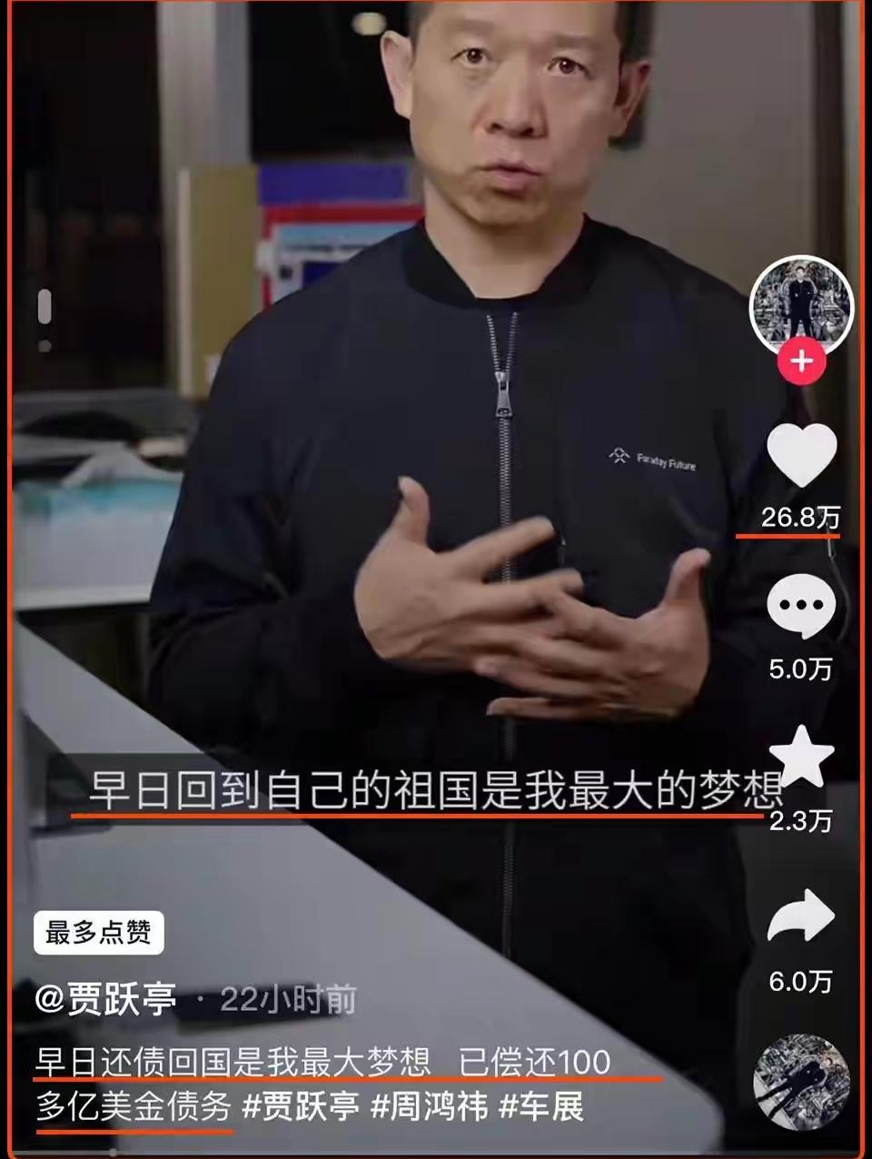贾跃亭最新发话,将加速偿还中国债务。老贾说按照美国法律来说,我早已没有债务缠身,但俺还是会负责到底,将剩余中国债务还完。爷们,给你点赞。[笑哭] 贾跃亭嘴里说的,已偿还的100亿美元债务,是通过如下方式实现的:要求债主们把债务转成FF的股份,债主们没有办法,只得签字同意。可如今,FF的股价仅1美元多,总得市值不到1.5亿美金。贾总确实还“完”了。 如今,贾总说要加速偿还剩余资金。我纳闷一个事情,贾总没有造出几辆车,为何还能源源不断得进行融资,这钱来自何处呢? 要是有明白人的话,在评论区给讲讲呗!