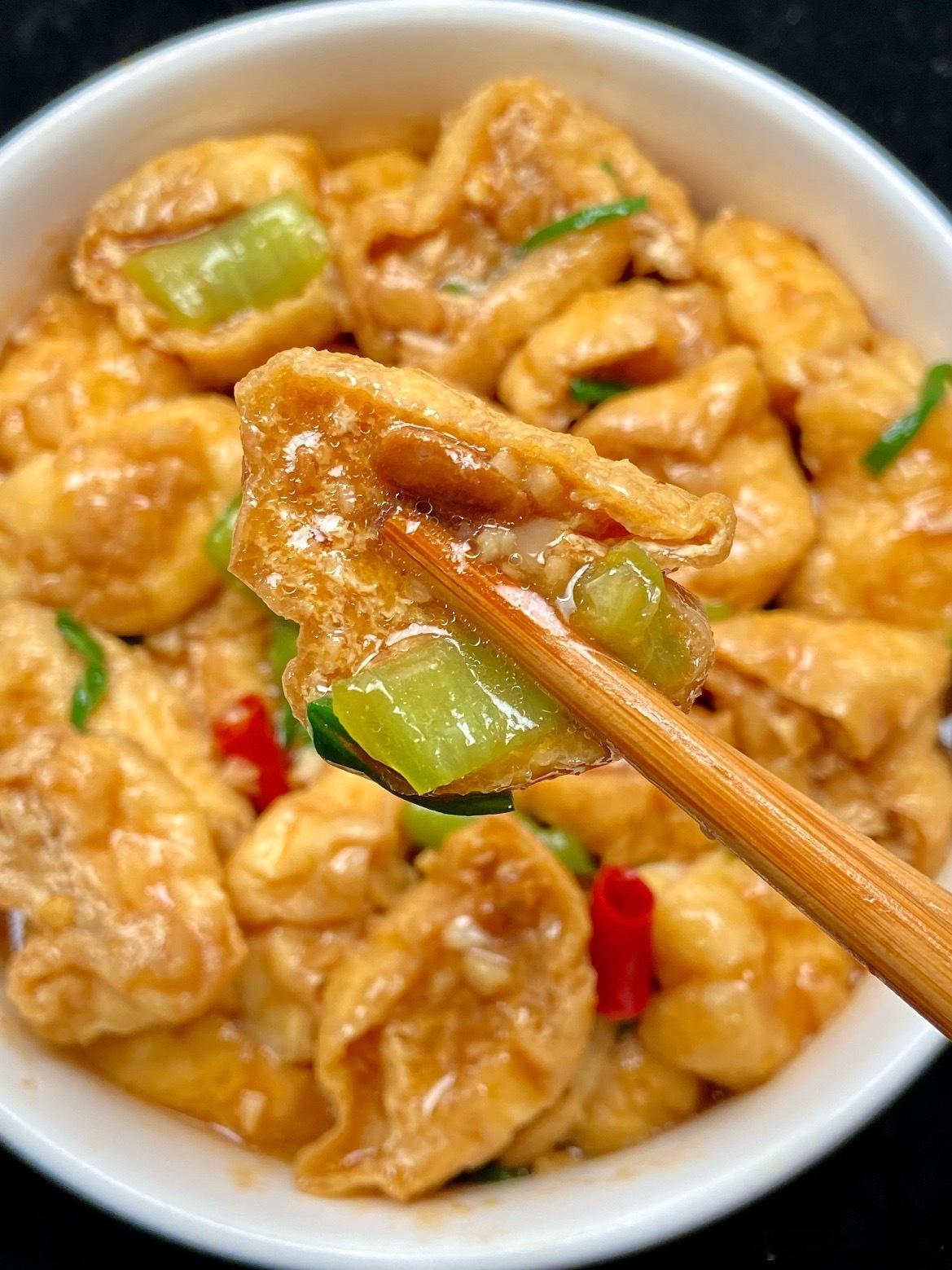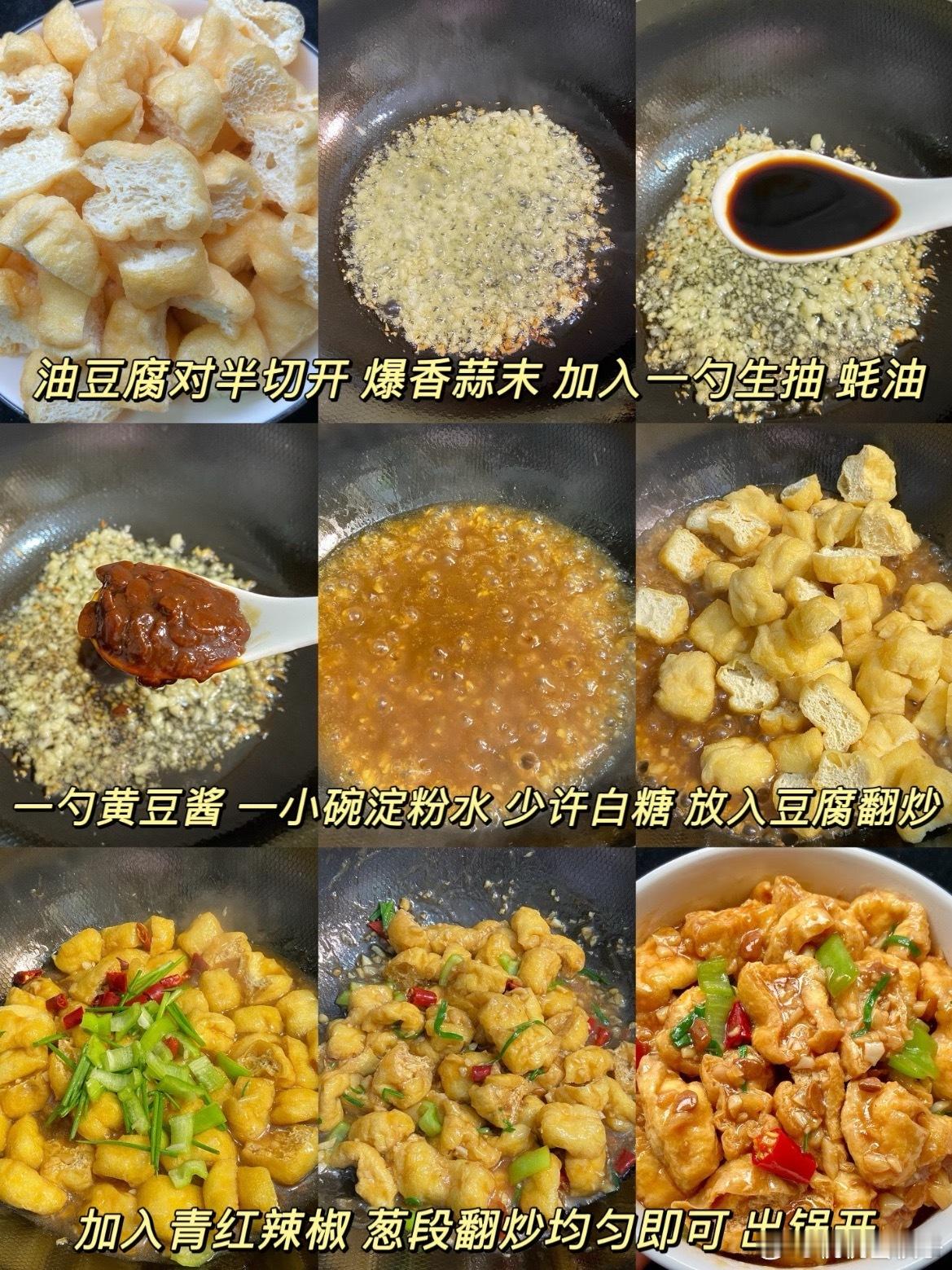 🔥油豆腐脑袋真的不能错过!!香辣豆泡,5分钟搞定下饭神器!在闺闺家吃过一次,一口爆汁,真的绝了豆泡这样做真的能连干三碗饭!吸饱酱汁的豆泡比肉还香~👩🏻🍳做法:豆泡对半切开蒜末爆香,加生抽+蚝油+黄豆酱+白糖,淋淀粉水勾出浓稠酱汁🤏🏻灵魂收尾:撒青红椒和葱段翻匀,辣椒的清新刚好解腻咬开瞬间汤汁在嘴里炸开,香辣中带着微甜,拌米饭香迷糊了!零失败快手菜,打工人的晚餐之光✨
