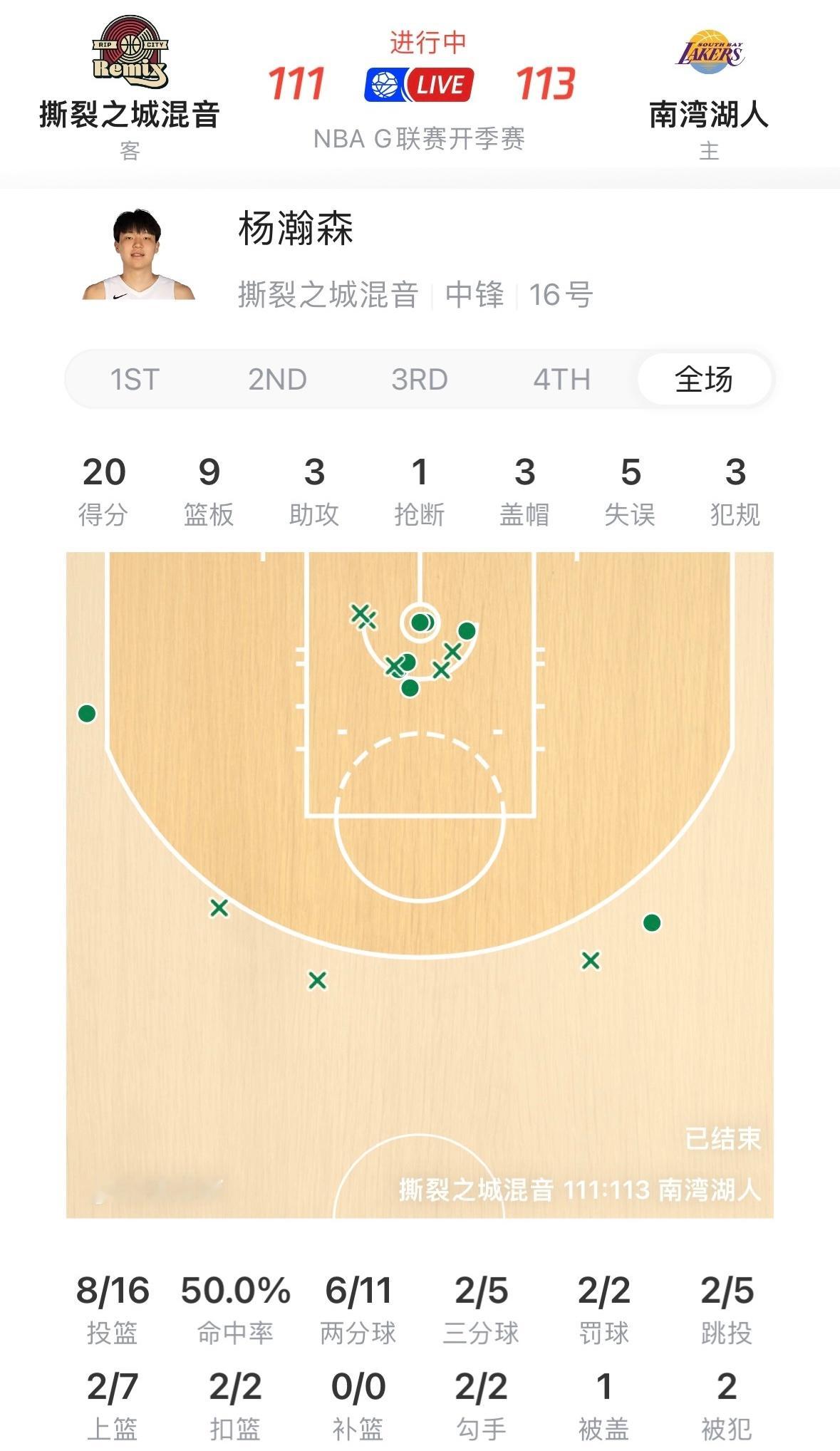 混音队眼看要反超无望了,杨瀚森连续命中两记三分,最后2分惜败。全场比赛小杨20分9篮板3助攻1断3帽5失误,16中8,三分5中2,罚球2中2,越来越好!
