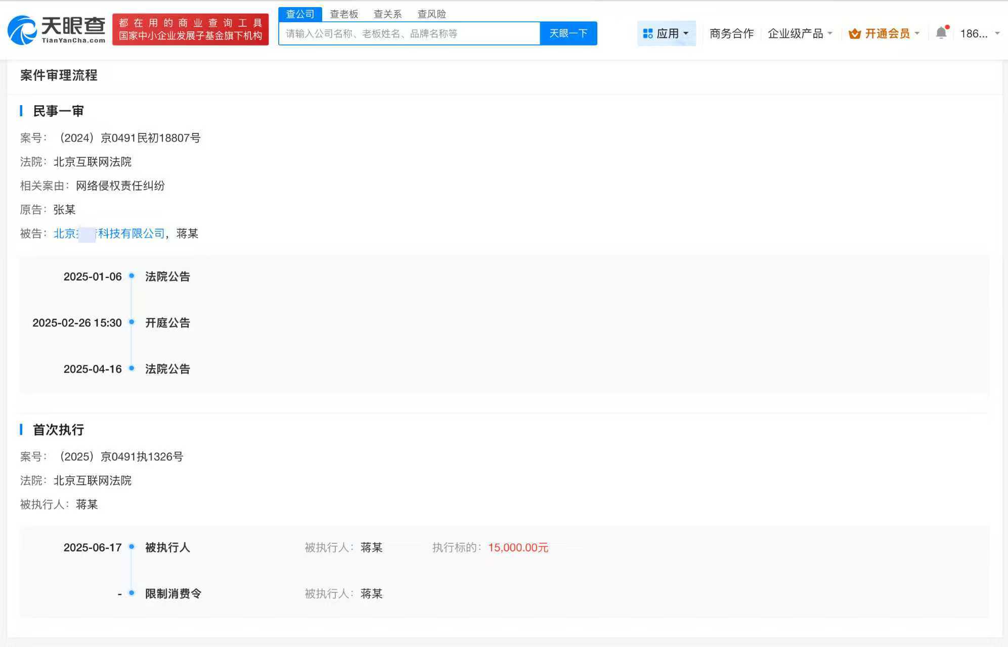 天眼查App显示,近日,张艺兴诉蒋某网络侵权责任纠纷案新增一则限制消费令信息,因未按执行通知书指定的期间履行生效法律文书确定的给付义务,被告蒋某被采取限制消费令措施。案件流程显示,今年6月,蒋某已被执行1.5万元。
