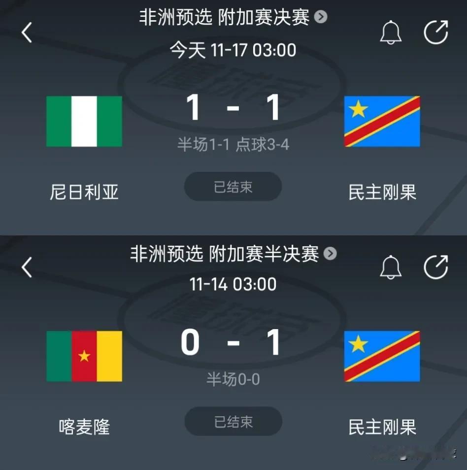 非洲雄狮和非洲雄鹰都被民主刚果淘汰了,国足即便进了世预赛附加赛,也很难稳赢民主刚果。 2026美加墨世界杯非洲区预选赛附加赛半决赛,民主刚果1比0战胜喀麦隆。决赛,民主刚果点球击败尼日利亚,晋级洲际附加赛。 喀麦隆拥有曼联前锋姆伯莫、河南名宿建名宿巴索戈、北京国安名宿恩加德乌,被誉为非洲雄狮。 尼日利亚拥有奥斯梅恩、卢克曼、伊沃比等巨星,被誉为非洲雄鹰。 民主刚果进步神速,已经有了战胜非洲传统强队的实力。