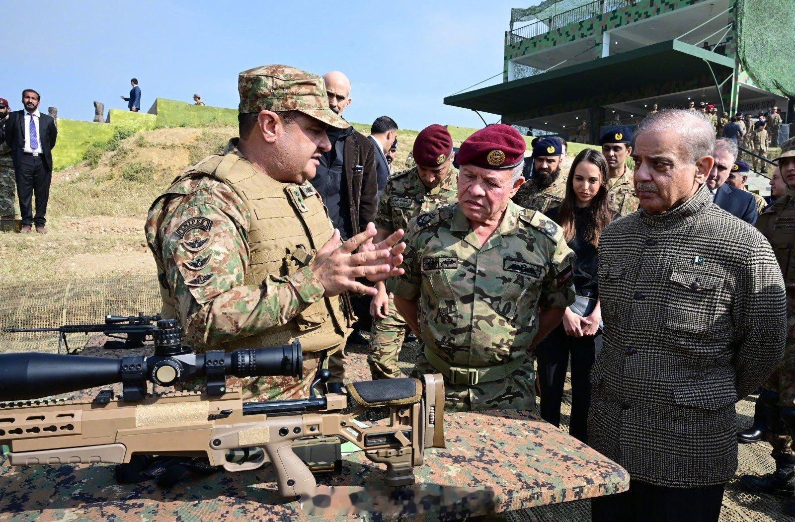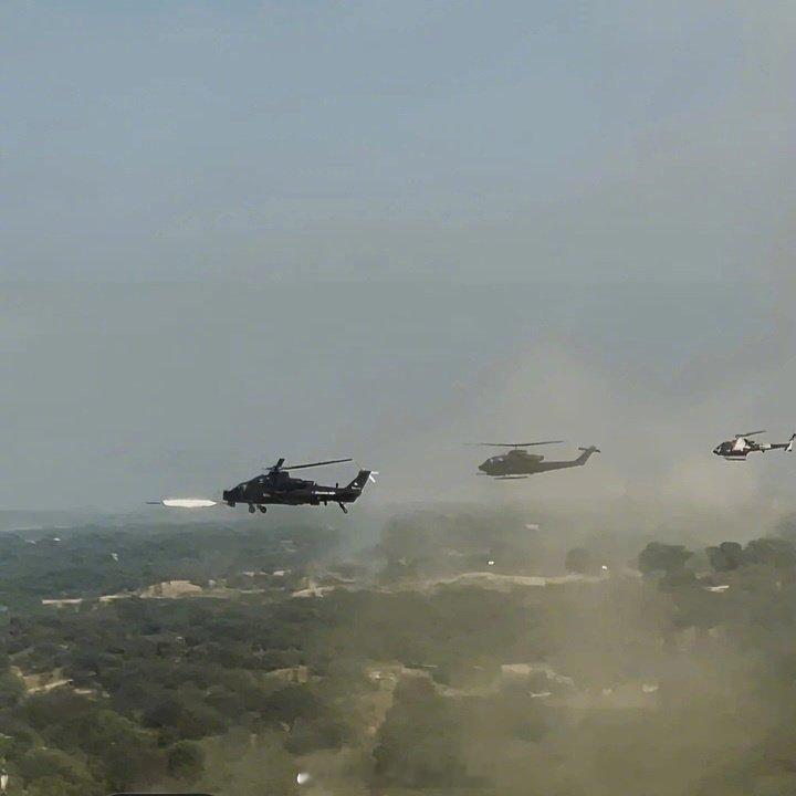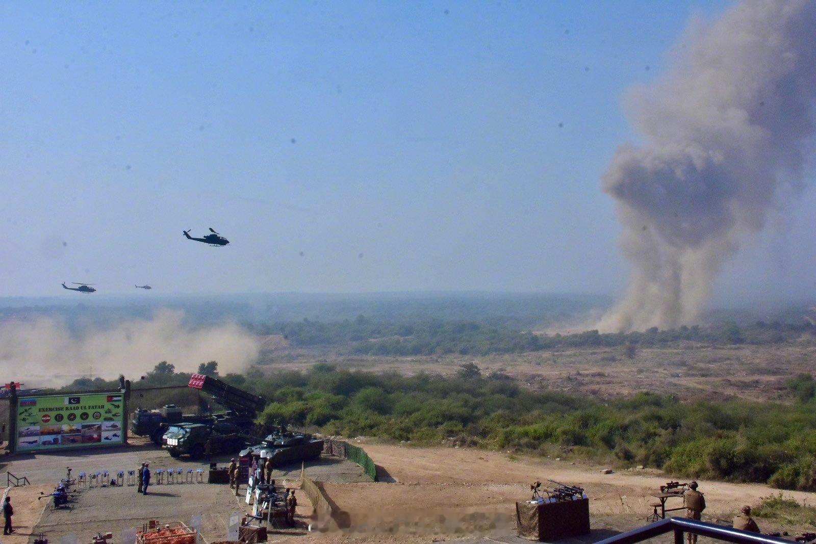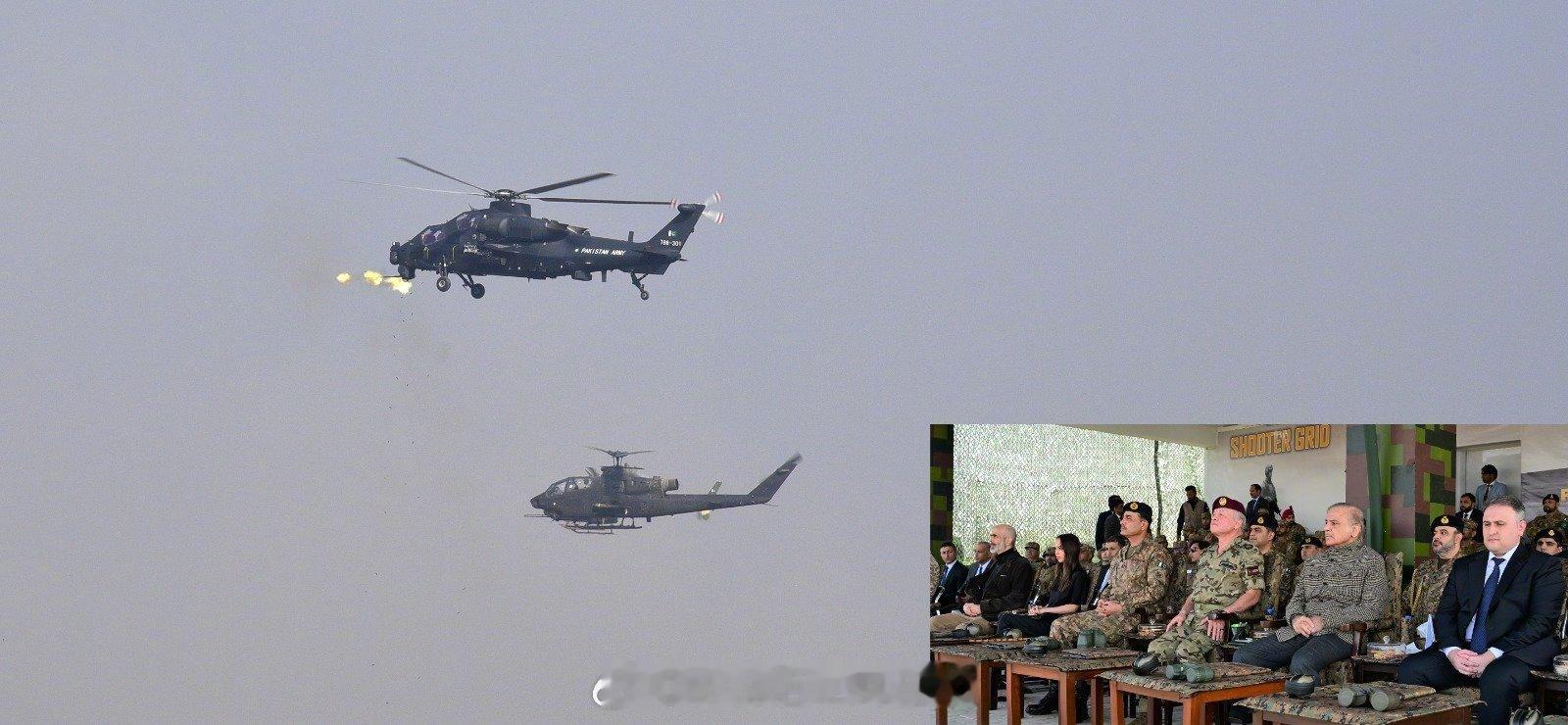 巴基斯坦的"Raad ul Fatah"综合军事演习在旁遮普省杰赫勒姆开始。约旦国王阿卜杜拉二世、总理谢赫巴兹·谢里夫和陆军参谋长阿西姆·穆尼尔将军作为首席嘉宾出席了演习。图片显示了中国产直10ME与美国眼镜蛇直升机共同组队进攻的画面。