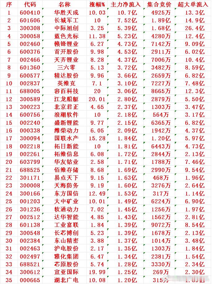 11月17日开盘45分钟,主力资金“买入的 ”的35名单一览!华胜天成:净流入10.7亿元;长城军工:净流入7.52亿元;中际旭创:净流入5.39亿元;蓝色光标:净流入5.23亿元;赣锋锂业:净流入4.73亿元