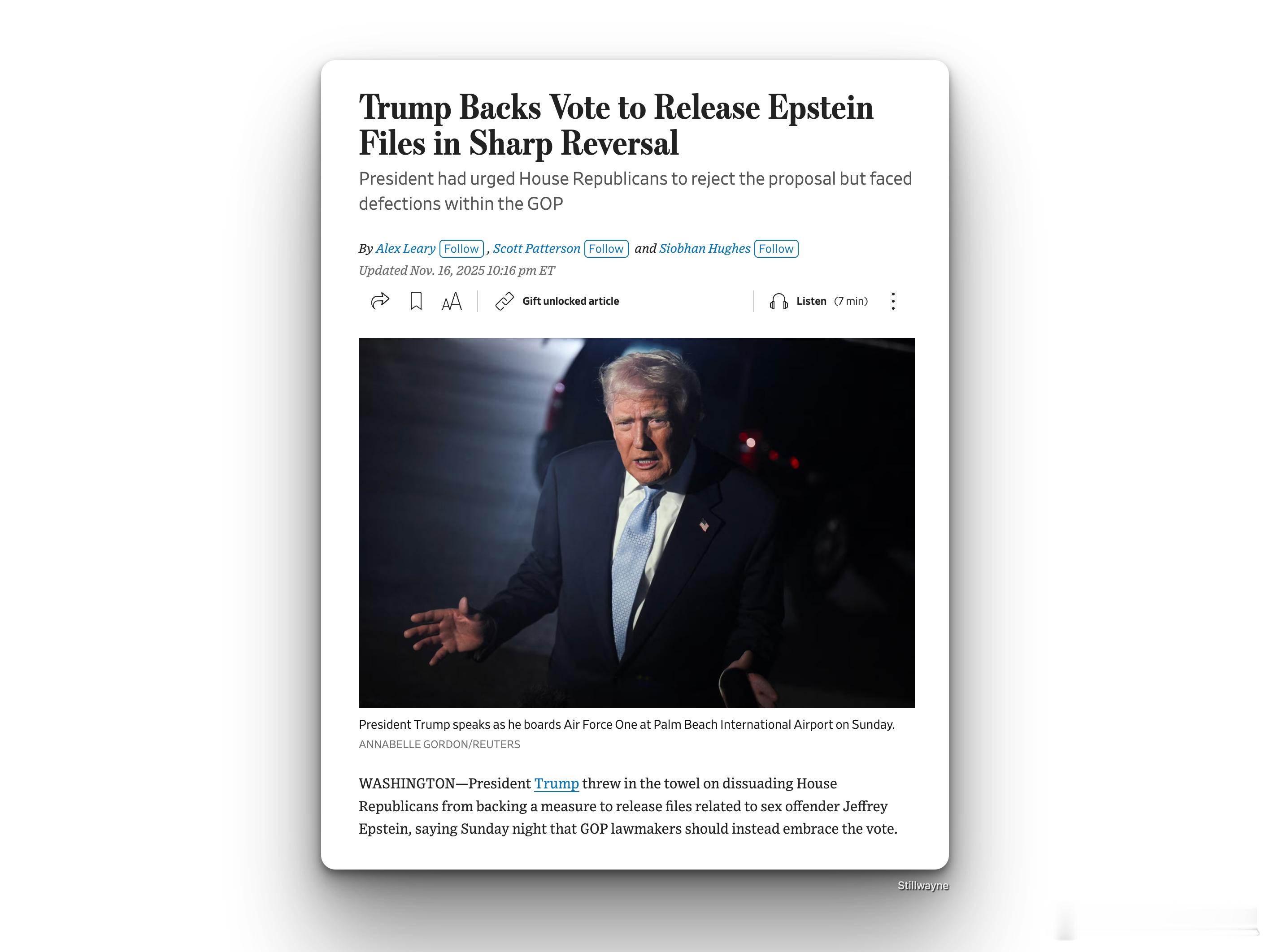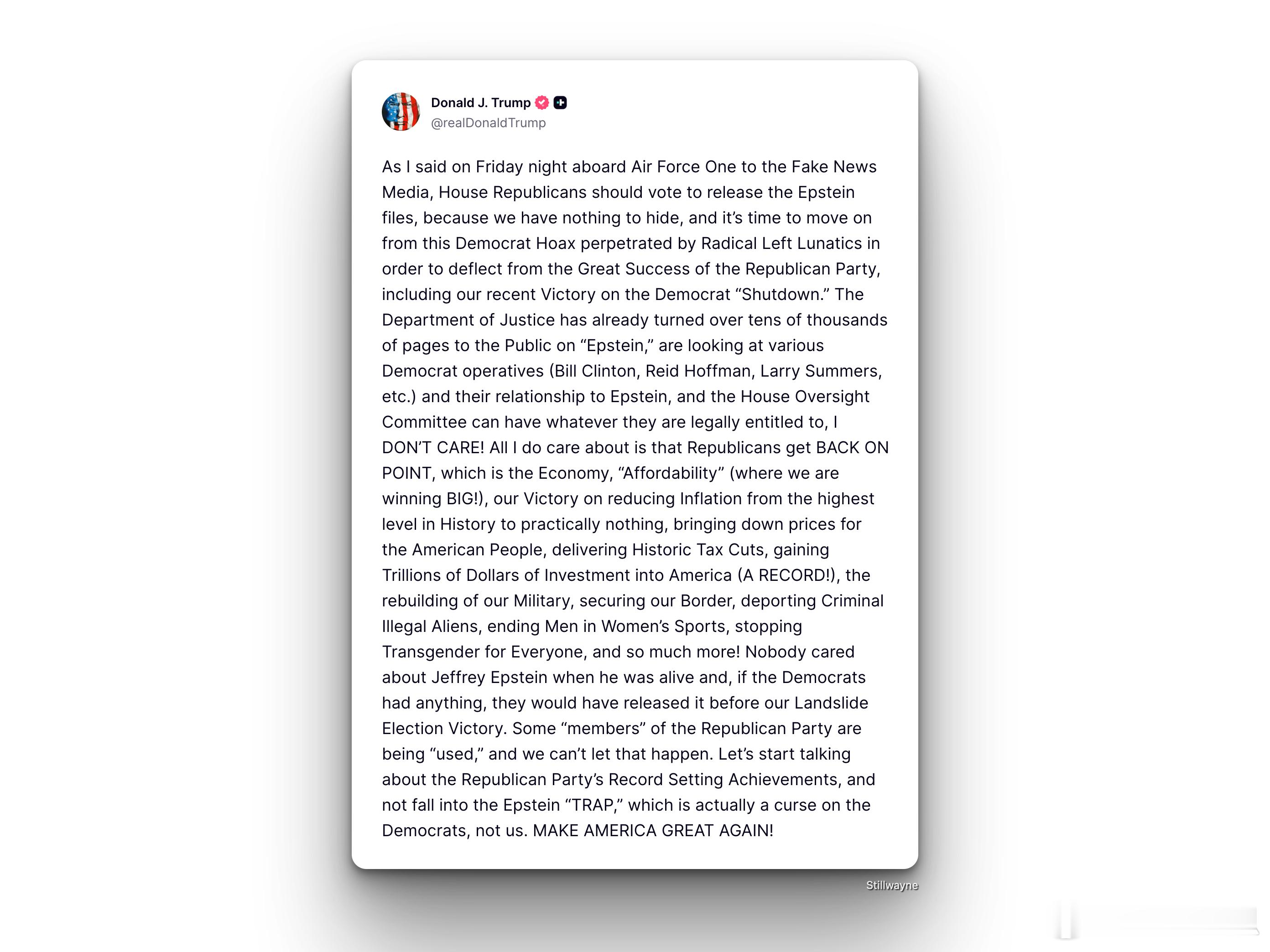 为了避免更尴尬的情况发生,特朗普转而支持公开爱泼斯坦档案特朗普周日晚间表示,他放弃了劝阻众议院共和党人支持一项公布爱泼斯坦有关的文件的法案的努力,并称共和党议员应该支持这项投票。本周的投票被视为对共和党人忠于总统的一次重大考验。此前预计,当这项法案提交众议院表决时,数十名共和党人可能会与总统决裂。而特朗普刚刚发布的声明避免了白宫可能面临的尴尬局面。特朗普在社交媒体上写道:“众议院共和党人应该投票公布爱泼斯坦档案,因为我们没有什么可隐瞒的,是时候摆脱民主党的骗局了。”