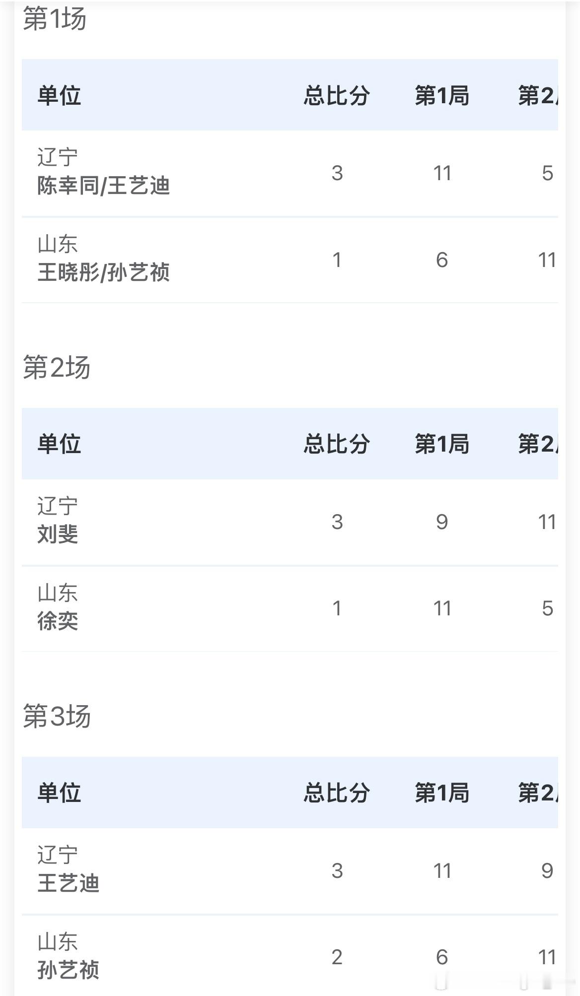 女子团体小组赛 - D组辽宁3-0山东陈幸同/王艺迪3比1王晓彤/孙艺祯刘斐3比1徐奕王艺迪3比2孙艺祯