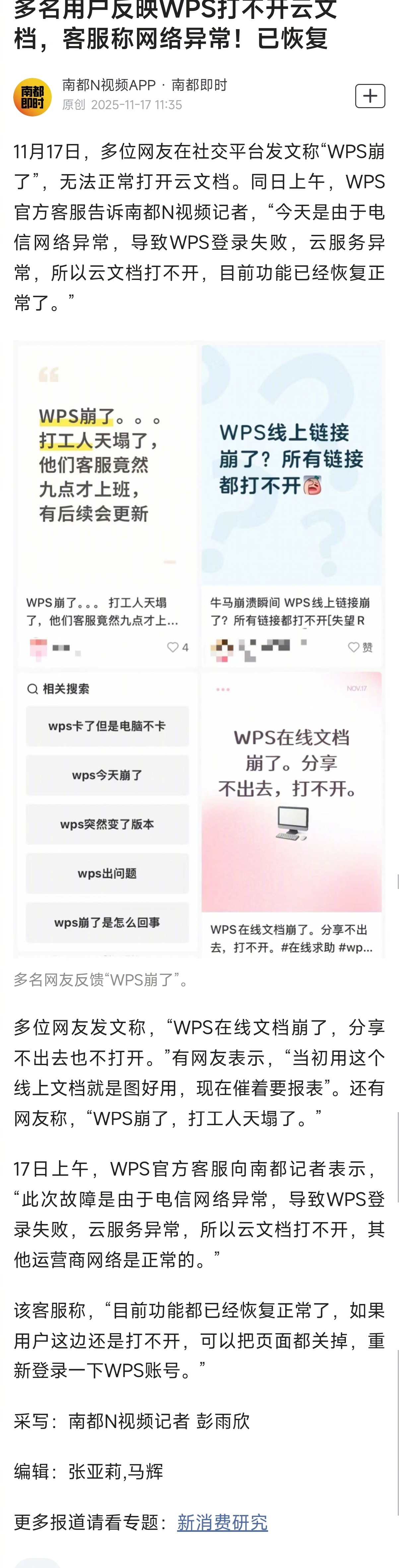 【多名用户反映WPS打不开云文档,客服称网络异常!已恢复】11月17日,多位网友在社交平台发文称,无法正常打开云文档。同日上午,WPS官方客服告诉南都N视频记者,“今天是由于电信网络异常,导致WPS登录失败,云服务异常,所以云文档打不开,目前功能已经恢复正常了。”