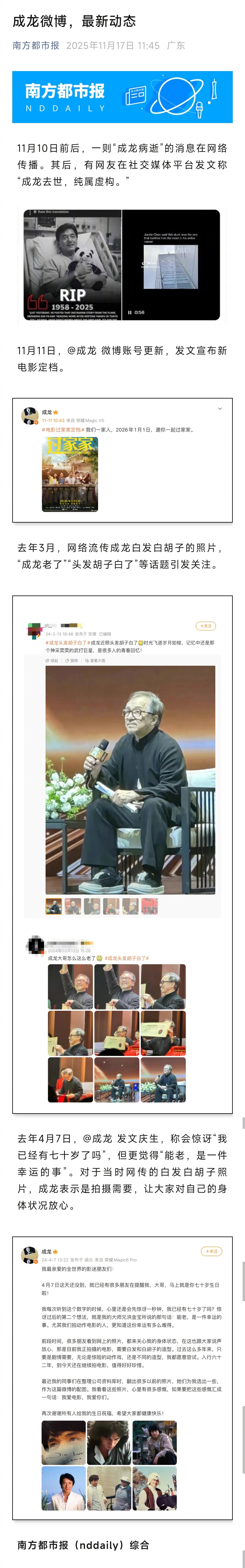 #成龙病逝是谣言 #【成龙微博账号更新 辟谣病逝传言】11月10日前后,一则“成龙病逝”的消息在网络传播。其后,有网友在社交媒体平台发文称“成龙去世,纯属虚构。” 11月11日, 微博账号更新,发文宣布新电影定档。今年3月,网络流传成龙白发白胡子的照片,“成龙老了”“头发胡子白了”等话题引发关注。4月7日, 发文庆生,称会惊讶“我已经有七十岁了吗”,但更觉得“能老,是一件幸运的事”。对于当时网传的白发白胡子照片,成龙表示是拍摄需要,让大家对自己的身体状况放心。