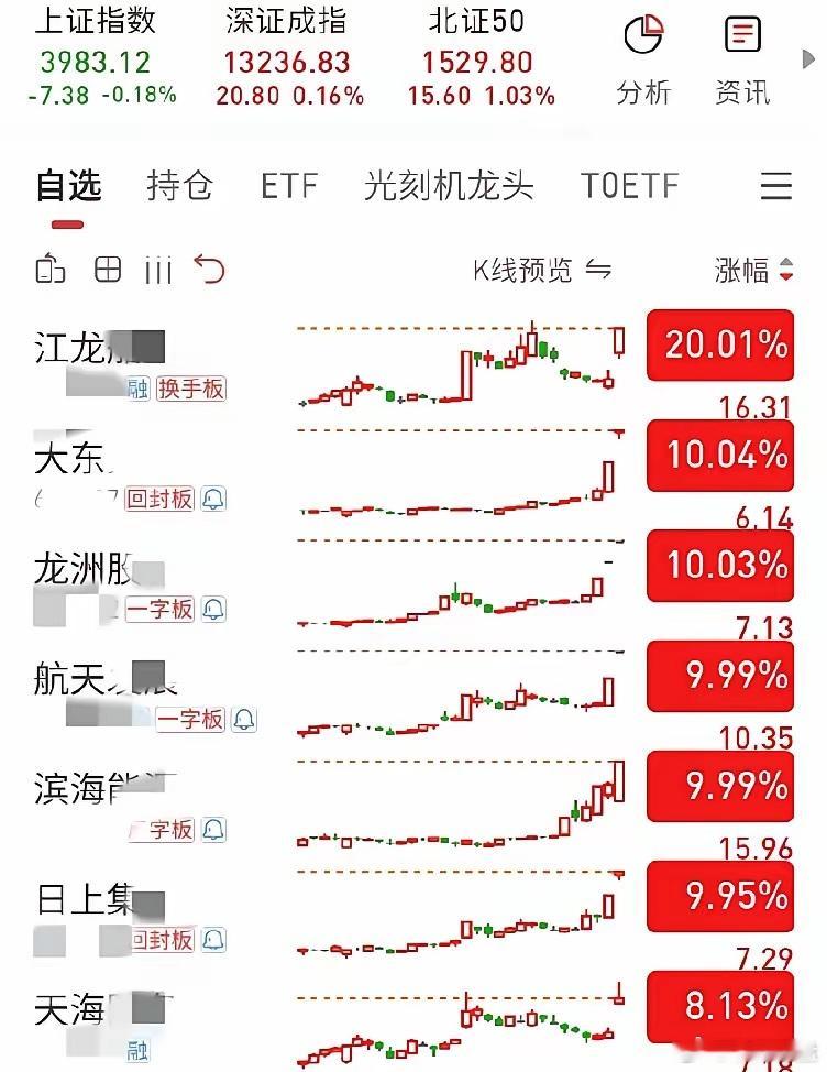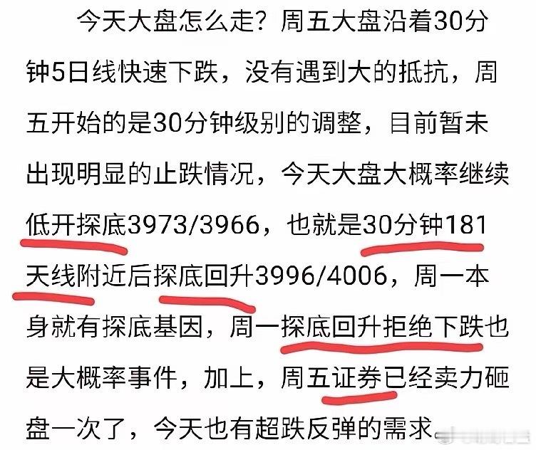周一午评:早盘如期探底,下午大盘是接着跌还是先跌后涨?上午大盘果然低开后,跌到30分钟181天线附近就稍微拉了点起来。科创板早盘逆势涨了一波,大科技板块也有超跌反弹的迹象,但今天上午最亮眼的还是航空、航海相关的军工板块,果然跟预期一样异动拉升,领涨全场。上周涨得火、甚至涨停潮的医药医疗,今天全在调整。现在防御性板块轮着涨,给大盘撑着场面,市场里一半涨一半跌,还是有不少赚钱机会的。再看三大指数的表现:上证指数上午跌到了30分钟181天线(大概3960点附近),符合预期;创业板和科创板经过上周五的大跌,今天比大盘先启动超跌反弹。不过题材股大多在跌,大科技板块内部也分化严重,不是整体都涨。还有证券、银行、保险这些大金融板块,上午都跌了1%左右,集体砸盘,所以大盘上午的走势比创业板、科创板弱不少。下午大盘会怎么走?上午已经跌到30分钟181天线3960点附近了,下午大概率会先探底回升,涨到3990-3996点之间,之后可能又会小幅回落。整体来看,下午大盘大概率在3965点到3990点之间来回震荡,全天应该是探底回升后收一根震荡小星线的走势。要注意,30分钟181天线只是个暂时的支撑,明天还得确认30分钟265天线这个关键的多空分界线能不能守住。军工板块果然如期异动拉升,选对方向的话,接着安心拿住赚钱就行!