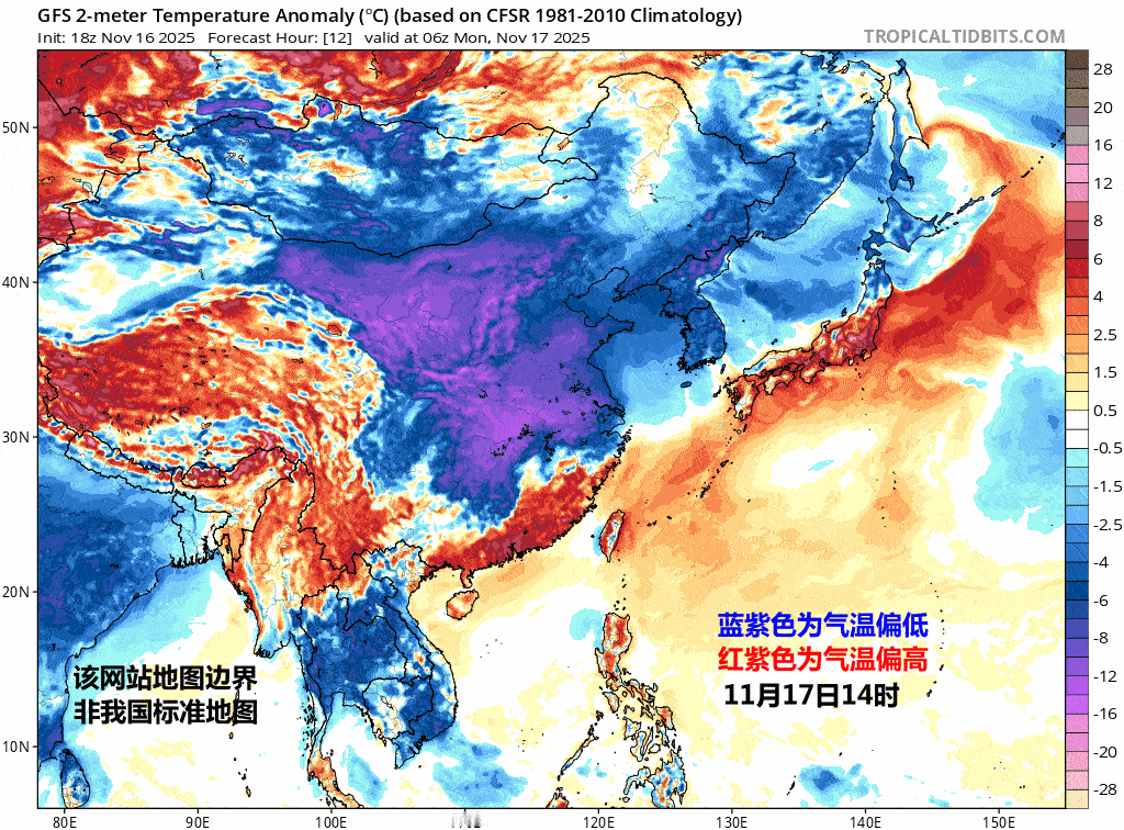 【一周天气——气温触底回升】本周(11月17日-23日),冷空气虎头蛇尾,周初因为寒潮影响,气温大面积创新低,并且大风也会从北吹到南,海上风更大。之后气温从北到南,陆续回升,周末气温又转为偏高。而且寒潮过后,干冷空气的冷属性逐渐丧失,干的特征保留,我国大部地区空气会很干燥,包括南方。具体关注:1、降水周一(17日),是本周降水范围最大的一天。冷暖空气交汇,使得长江沿线一带多地有降雨。陕西东南部、湖北西北部等地局地有大雪(5~9毫米)。18-19日干冷空气继续南下,我国降水逐渐向西南收缩。本周中后期,降水主要就在云南西部、四川西部、西藏东部一带。此外22日新疆北部还有短暂降雪。本周我国北方大多数地区,天气晴朗干燥。18日开始江南地区、19日开始华南也会变得干燥。江南华南在周后期的干燥天气将持续,午后相对湿度可能降至30%附近甚至更低(图4)。无论南北方,都要注意补水保湿,警惕可能出现皮肤和嘴角干裂、起皮的情况,穿着化纤衣物,还要小心被静电噼啪电到。2、气温因为寒潮影响,17-18日黄河以南多地,将出现6-10℃的降温,其中,重庆北部和东部、湖北西部、贵州北部和东部、江淮东部、江南北部、广西东部等地的部分地区降温10~12℃,安徽南部局地降温可超过14℃。18-19日晨,我国多地气温将创立秋后新低。19日晨,最低温度0℃线将南压到苏皖南部至湖北中部一带。不过这轮寒潮过程持续时间不长。18日白天,内蒙古就先率先升温,19日东北气温也会大幅上升,气温从偏低一下转为偏高。南方地区在20日以后,白天最高气温也逐渐回归正常转为偏高。不过19-20日、23-24日还有冷空气可能影响北方地区,但降温并不剧烈,不会改变周后期到下周初,震荡升温的大趋势。本周部分城市的气温波动会超10℃,比如哈尔滨17-22日,升温11℃、长春17-23日升温11℃、沈阳17-22日升温11℃、济南17-23日升温11℃、郑州17-23日升温11℃、上海18-23日升温11℃。广州17-18日先降12℃,18-23日再升8℃;南宁17-18日先降11℃,18-22日再升10℃。另外寒潮过后,因为白天气温上升更快更明显,导致本周中后期,昼夜温差明显加大,即便在南方地区,也有可能看到10℃以上的昼夜温差。比如武汉20日最低预计零下1℃、最高预计16℃,温差可达17℃。通常昼夜温差较小的四川盆地,成都和重庆,20日的昼夜温差也会超10℃(成都4-17℃、重庆5-16℃)。这次寒潮的影响,可能推动西安、济南、郑州入冬。但长江中下游等地能否入冬悬念较大,可能出现几个单日的冬日,但5天滑动平均,是否能满足5组冬日,待定观察。这个可能要等着下周才能见分晓。图6为气温偏低偏高预报,图7为最高气温预报,图8为部分城市气温预报表格。3、大风17日中东部的风依然不小,而且17-18日东部和南部海区先后有7~8级、阵风9~10级大风。而且台湾海峡和南海北部的大风天气,可能要持续多日。不过大风的到来,也彻底吹散了雾和霾,本周空气质量不错。图5为形势场预报,我国东部地区处于地面高压前部,等压线密集,扩散条件有利。图9为阵风预报。
