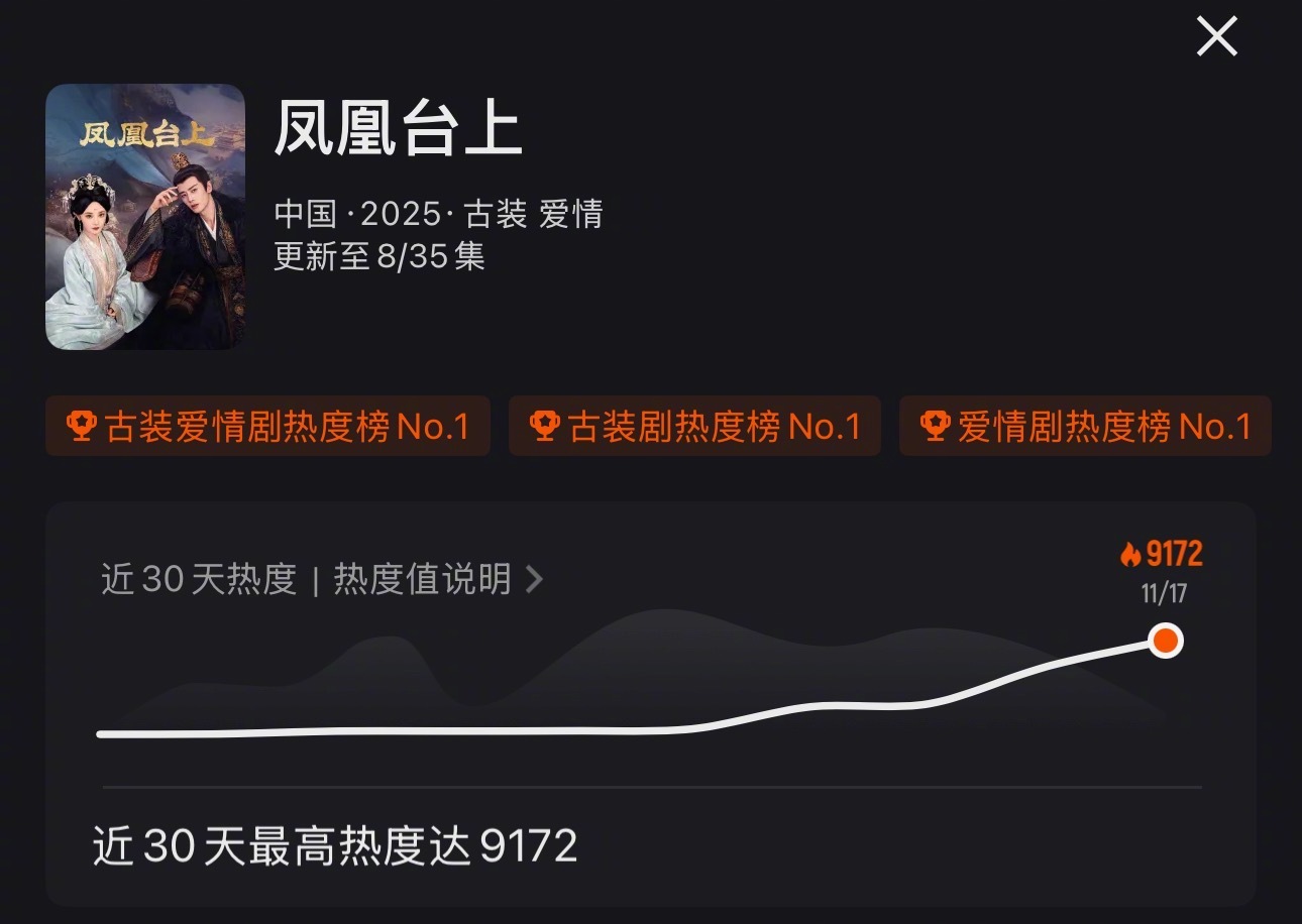 任嘉伦彭小苒《凤凰台上》热度目前已突破9100,大家觉得播的效果如何?