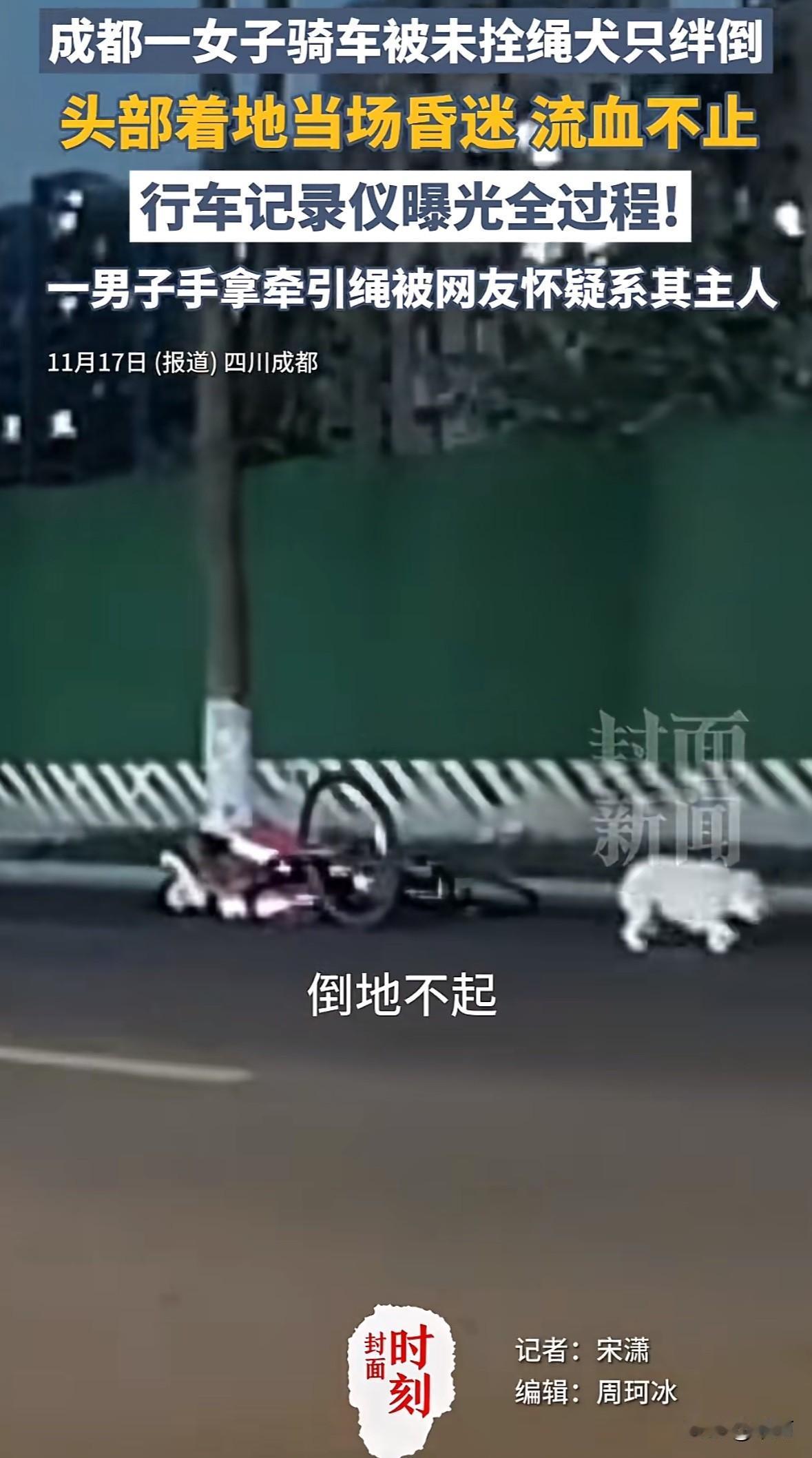 11月15日成都新都区,一名女生骑车时被突然窜出的未拴绳白色宠物狗绊倒,因没戴头盔,头部着地流血还疑似抽搐。路人赶紧打了120和110,车主的行车记录仪拍下全程,视频里有个拿牵引绳追狗的男子,被怀疑是狗主人,但至今没找到。女生已进ICU,可能要做手术。 这事儿看着揪心,其实早有规定,成都养犬出门得拴绳,可总有人心存侥幸。不拴绳的狗不仅害了别人,也给养狗人招骂。希望赶紧找到狗主人担责,也盼着相关规定能落实到位,加大监管和处罚力度。同时提醒大家,骑车一定要戴头盔,养狗的更得守规矩,文明养犬才是对自己和别人负责。