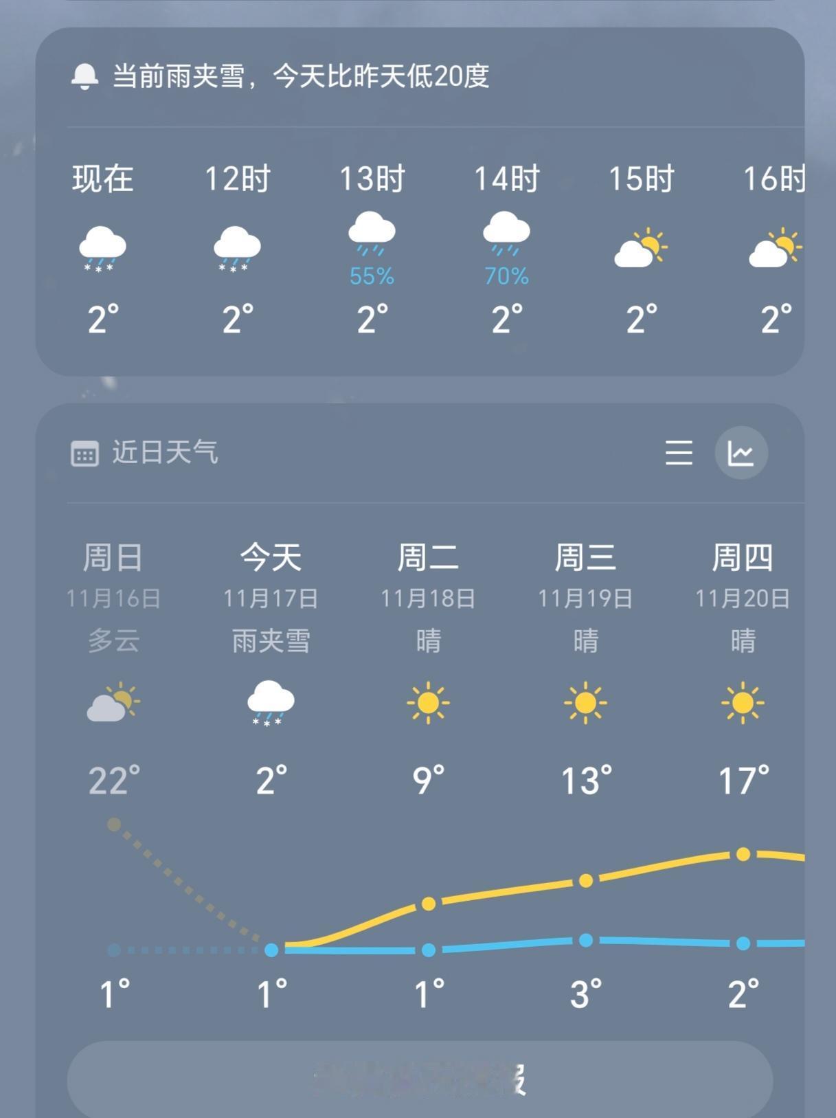 下雪啦!信阳今天下雪啦!今年的第一场雪,昨天最高温度还21℃,中午穿秋衣干活还出汗,今天突然来个一夜入冬,雨夹雪说来就来。直接让人不知道衣服咋穿,今天应该有好些人因为衣服穿少了,而冻的直打摆子吧?你们那里下雪了吗?