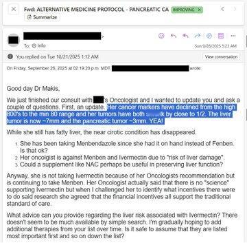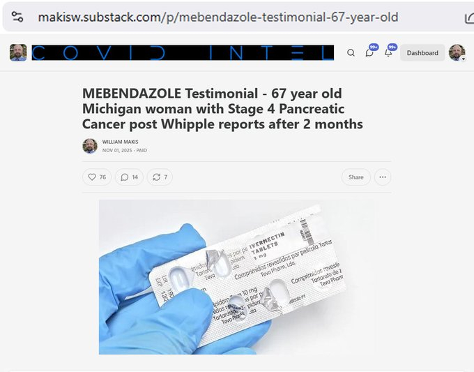 最新文章:甲苯咪唑治疗见证——一位67岁的密歇根州女性,患有四期胰腺癌,在接受惠普尔手术两个月后报告疗效我很少能收到仅使用一种再利用药物就能取得疗效的案例和证词,但这种情况确实会发生! 😃故事密歇根州一名67岁女性,胰腺癌晚期(4期),曾接受惠普尔手术。2025年8月中旬,她开始了:甲苯咪唑 1500 毫克/天两个月后的结果:CA19-9 800年代至80年代胰腺和肝脏肿瘤缩小了50%。我正在做一件全世界所有肿瘤科医生都没做过的事:我将分享癌症患者本人的亲身经历,用他们自己的话语讲述。因为我相信患者体验比任何事情都重要。它掩盖了大型制药公司、存在利益冲突的医生以及被收买的政客的喧嚣。病人应该永远放在第一位,但在我们现代社会,癌症病人却往往被放在最后。这种情况将会改变。NEW ARTICLE: MEBENDAZOLE Testimonial - 67 year old Michigan woman with Stage 4 Pancreatic Cancer post Whipple reports after 2 monthsIt's rare that I have testimonials and success stories from the use of just one repurposed drug but it does happen! 😃STORY67 year old Michigan woman with Stage 4 Pancreatic Cancer post WhippleIn mid August 2025, she started:Mebendazole 1500mg/dayResults after 2 months:CA19-9 800s to 80sPancreatic and Liver tumors shrunk by 50%I am doing something that no Oncologist in the world is doing:I am sharing testimonials from cancer patients themselves, in their own words. Because I believe the patient experience is more important than anything else.It drowns out the noise of big pharma, doctors who have conflicts of interest, and bought off politicians. The patient should always come first but in our modern world, the cancer patient comes last.That is going to change.