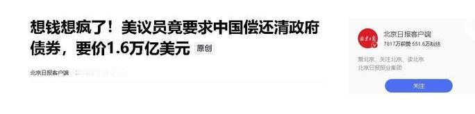 想钱想疯了,美媒:如果中国不还清朝借的1.6万亿百年国债,就赖掉8600亿美元国债。特朗普:必须让中国承担责任!中方的反击让美方如坐针毡。 先说说美国嘴里这1.6万亿“百年国债”到底是怎么回事。这哪是什么正经的借钱啊?全是清朝末年,那些列强拿着枪炮逼着清政府签不平等条约,顺带搞出来的“赃款”。 从《南京条约》的赔款,到《辛丑条约》的“庚子赔款”,每一笔钱都沾着中国人的血汗,说白了就是列强抢我们的钱。就说“庚子赔款”,当时清政府被硬逼着赔4.5亿两白银,分39年还清,连本带利滚到后来变成了天文数字,美国说的所谓“债权”,大多就从这儿来的。 可美国这套说辞,纯属揣着明白装糊涂。稍微懂点历史的都知道,新中国一成立就明说了:过去清政府签的那些不平等条约全不算数,帝国主义在咱们这儿的特权也都取消,这种靠侵略逼出来的“黑债”更别提了。 这可不是我们单方面“赖账”,国际上本来就有规矩,“恶债不继承”。意思很简单,靠侵略、压迫这些非法手段弄出来的债,新政府没义务还。美国自己也用过这招,二战后还带头免了德国、日本的战争债,怎么到咱们中国这儿,就翻脸不认账了? 更讽刺的是,美国威胁要赖的8600亿美债,跟那笔旧账压根不是一回事。我们手里的美债,是靠着正经国际贸易赚来的钱,实打实买的合法金融资产,受国际法保护着呢。美国要是真敢公然赖账,可不只是“欠钱不还”那么简单,等于直接把自己的信用招牌砸了。 要知道,美元能在世界上这么横,靠的就是各国对美债的信任。一旦美国开了“赖账”的头,各国银行肯定都慌着把手里的美债卖掉,美元的地位就得一落千丈,这对天天靠借钱过日子的美国来说,比割肉还疼。 面对美国这无理取闹,中国的反击直接戳中了他们的要害。外交部发言人当场就亮明态度:“这笔所谓的‘债’,根本就是帝国主义侵略咱们的证据,中国政府从来没认过,以后也绝不会认。 美国想拿老黄历干涉做生意,说白了就是霸权主义。至于美债,那是美国的信用保证,真敢赖账,后果自己扛。”这番话把历史和道理都摆得明明白白,一下点中美国的软肋,当场就让他们没了底气。 之前嚣张的美国媒体,这下也蔫了。他们自己心里门儿清,这招根本站不住脚。稍微查查历史就知道,当年美国拿了“庚子赔款”,后来又搞了个“退钱办学”的幌子,其实就是想培养些亲近美国的人,根本不是什么“善意借贷”。现在把这笔旧账翻出来当筹码,说白了就是贸易战没占到便宜,急得开始耍无赖了。 其实美国自己也清楚,这1.6万亿旧债根本成不了“杀手锏”,反倒显出自己又横又双标。咱们手里的8600亿美债,与其说是“中国的资产”,不如说是“美国的紧箍咒”,真把我们逼急了,只要稍微卖点美债,就能让美国金融市场抖三抖。 说到底,国家之间打交道,靠的是规矩和信用,不是耍无赖、翻老账。美国想拿百年前的侵略旧账做文章,既不认历史,又不讲道理,最后只能是搬起石头砸自己的脚。中国的反击之所以让美方坐不住,就是因为我们把历史和道理都摆得明明白白,让全世界都看清,到底谁才是真的不讲理。 说到底,国与国之间的交往,靠的是规则和信用,不是耍无赖、翻旧账。美国想拿百年前的侵略旧账做文章,既无视历史,又违背法理,最终只能是搬起石头砸自己的脚。中方的反击之所以让美方坐不住,就是因为我们把历史讲得明明白白,把法理摆得清清楚楚,让全世界都看清了谁才是真正的“不讲理”。