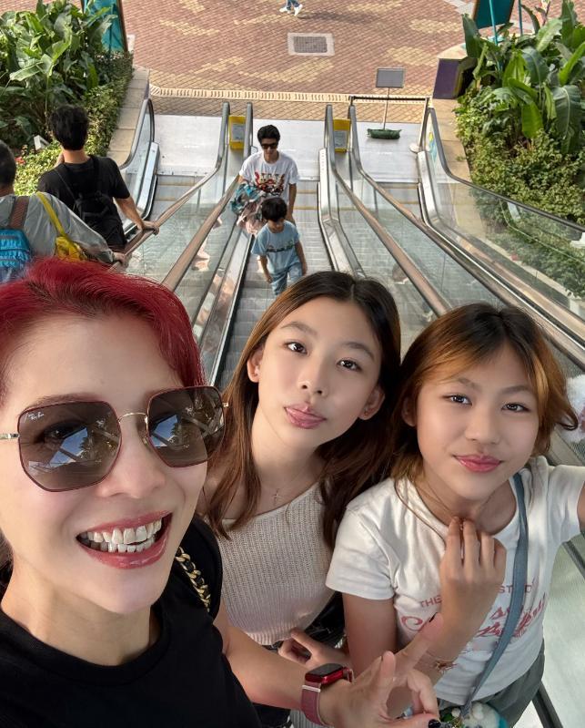 蔡少芬一家出游并庆祝小儿子6岁生日。她的两个女儿分别是14岁和11岁,个子都长得很高。