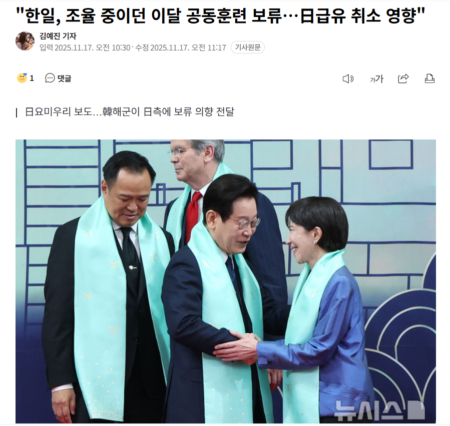 【韩日搁置原定于本月举行的联合训练,受日本取消加油支援影响】据《读卖新闻》17