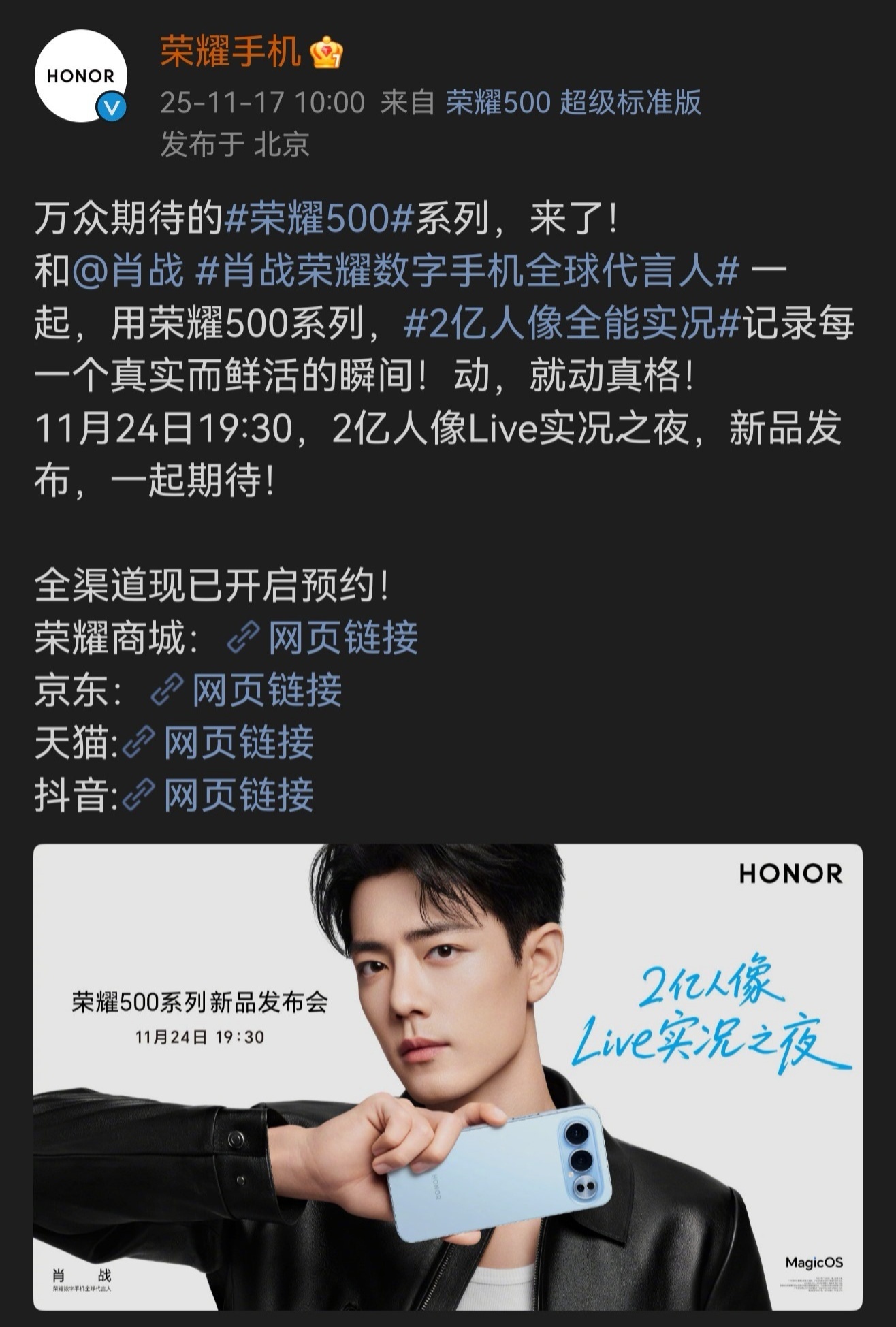 荣耀 500 系列新品发布会定在 11 月 24 日 了,由肖战代言!这次据悉会有两款型号,搭载骁龙 8 至尊版,电池容量至高到 8000mAh ,是“全系的越级配置”“双超体验”的新品。